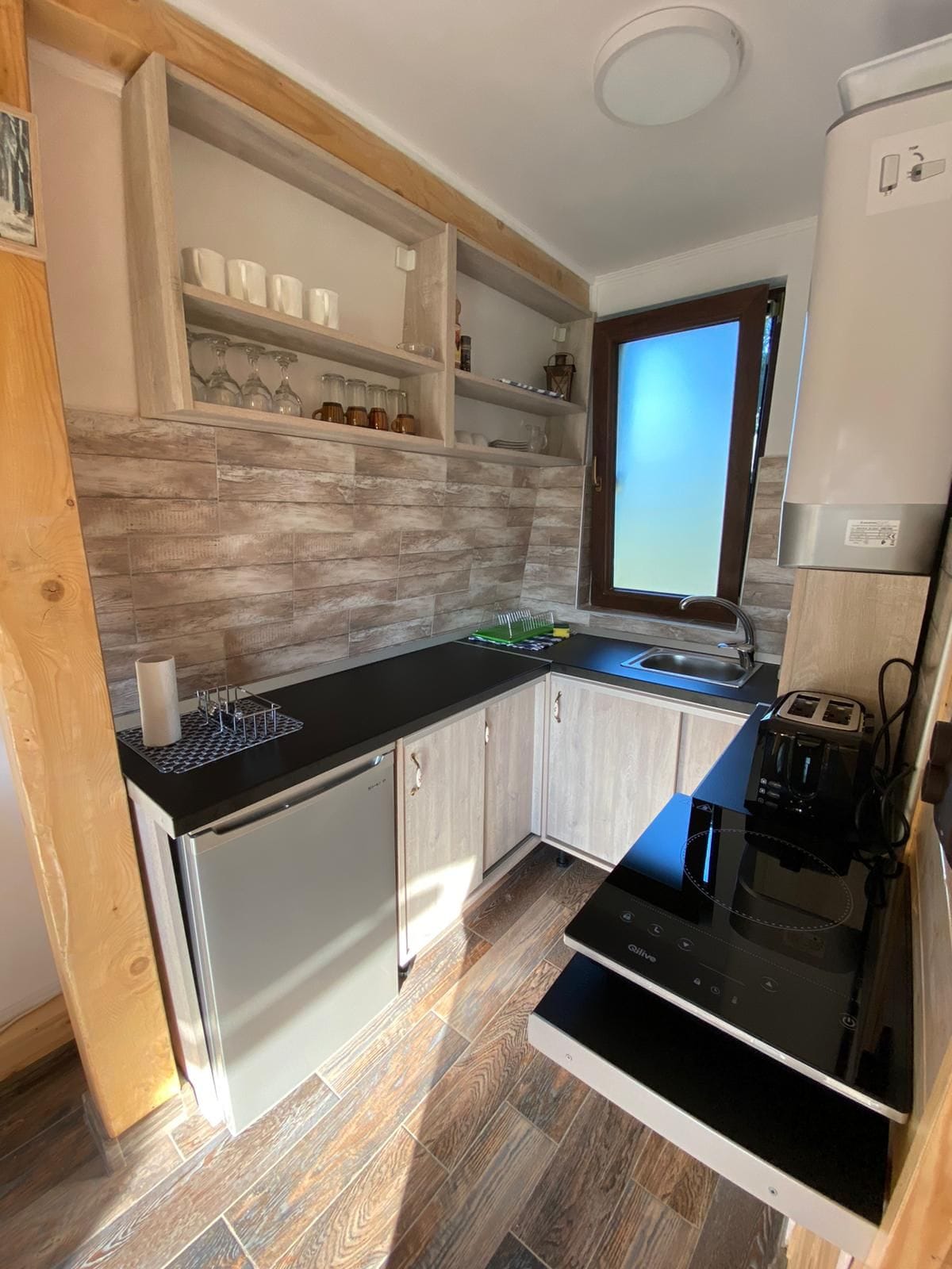 Descopera un tiny house unic, creat pentru intimitate si relaxare. Spatiul este gestionat foarte eficient, iar interiorul este creat manual, cu materiale reciclate. Casa este incalzita automatizat, cu peleti din lemn si flacara adevarata. La etaj veti descoperi toaleta si cabina de dus separata. Atentie la cele trei trepte verticale, acestea pot fi dificile pentru persoanele cu mobilitate redusa! Va rugam sa nu folosit aparate electrice cu putere mai mare de 1000W! Casa este adult-only.