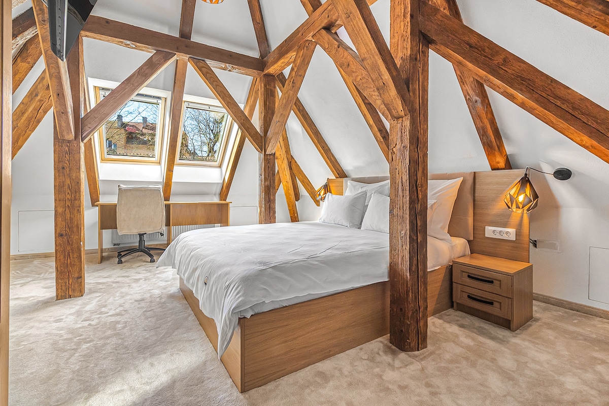 Originally built in 1910 during the Austro-Hungarian Empire, Castelului Boutique Guesthouse is steeped in history, once the gatekeeper’s residence. The guesthouse spans three levels: the ground floor houses a generous 30 sqm garage; the second floor, accessible via an interior staircase, features a modern open-space kitchen and living area (30 sqm) and a fully equipped 4 sqm bathroom. On the top floor, the attic bedroom (25 sqm) offers panoramic views of Tampa Mountain.