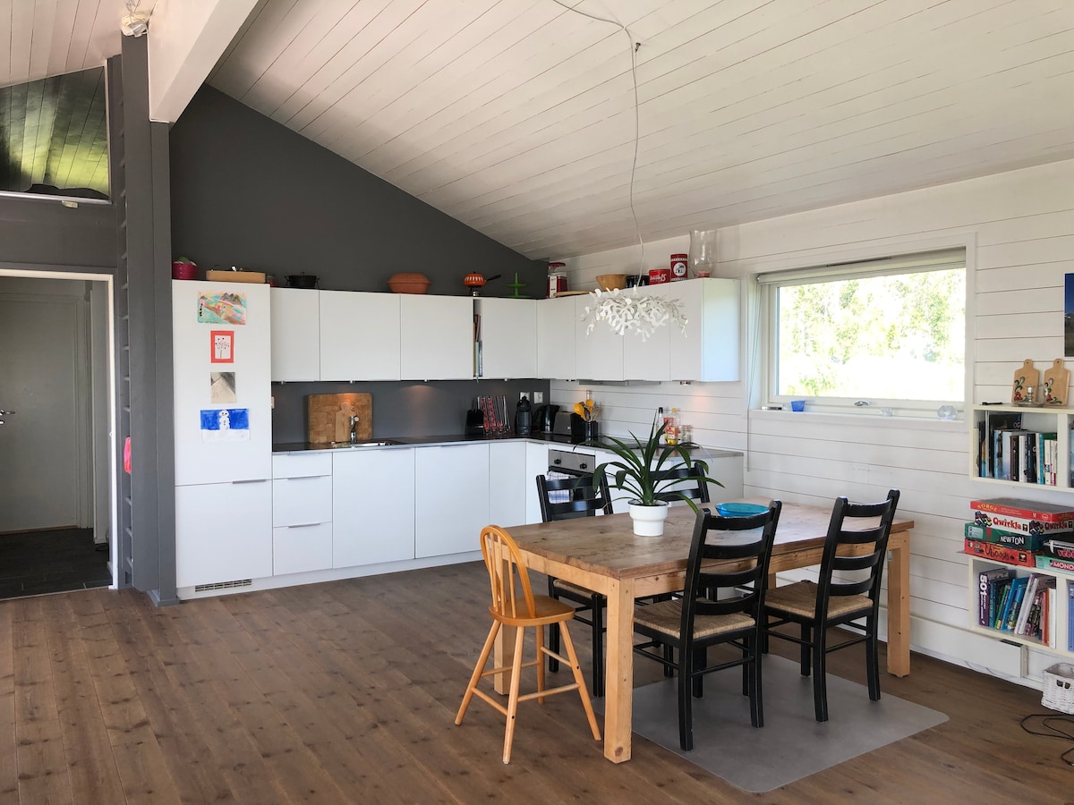 Newly built mountain lodge (2022) in massive wood. The apartment is inviting and cosy, with interior in Scandinavian style. You will find all the comfort and equipment you need to relax & enjoy delicious food and company after an active day! Have your morning coffee outside in the sun, overlooking the mountain tops. Light a fire, enjoy the views from the sofa & makes use of our books or boardgames. Maybe you prefer watching a movie on The Frame? Have a good night sleep in the fresh air!