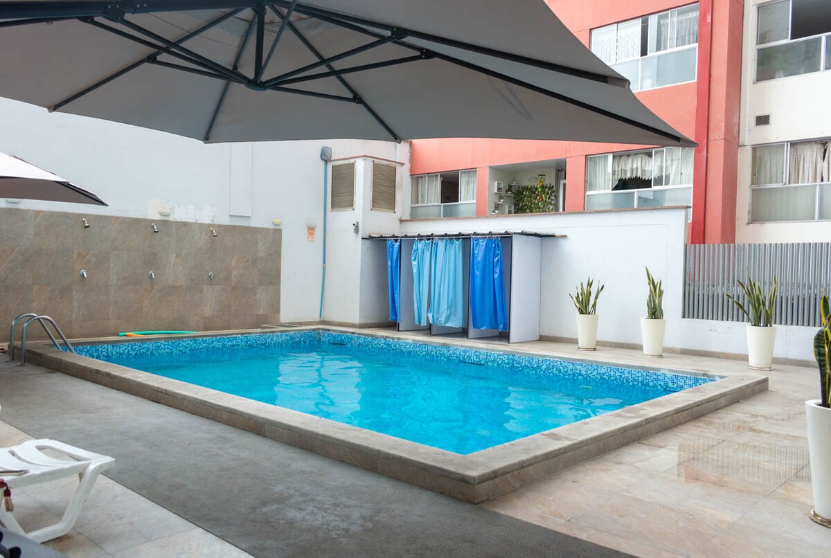 To elegantno predelano stanovanje je bilo zasnovano za vsako podrobnost. Nahaja se v Barrancu, z Mirafloresom in nekaj minutami od morja, se nahaja v stavbi z vsem, kar potrebujete, bazenom v 24. nadstropju s panoramskim razgledom na mesto, coworking in biljard (zahteva zgodnjo rezervacijo). Nudimo BREZPLAČNO: •kava in brezkofeinska kava • Wi-Fi visoke hitrosti •bazen (brez ponedeljka) •telovadnica • kuhinja •samostojni vstop •Zelo udobna postelja in blazine • 55 SmartTv: Prime video