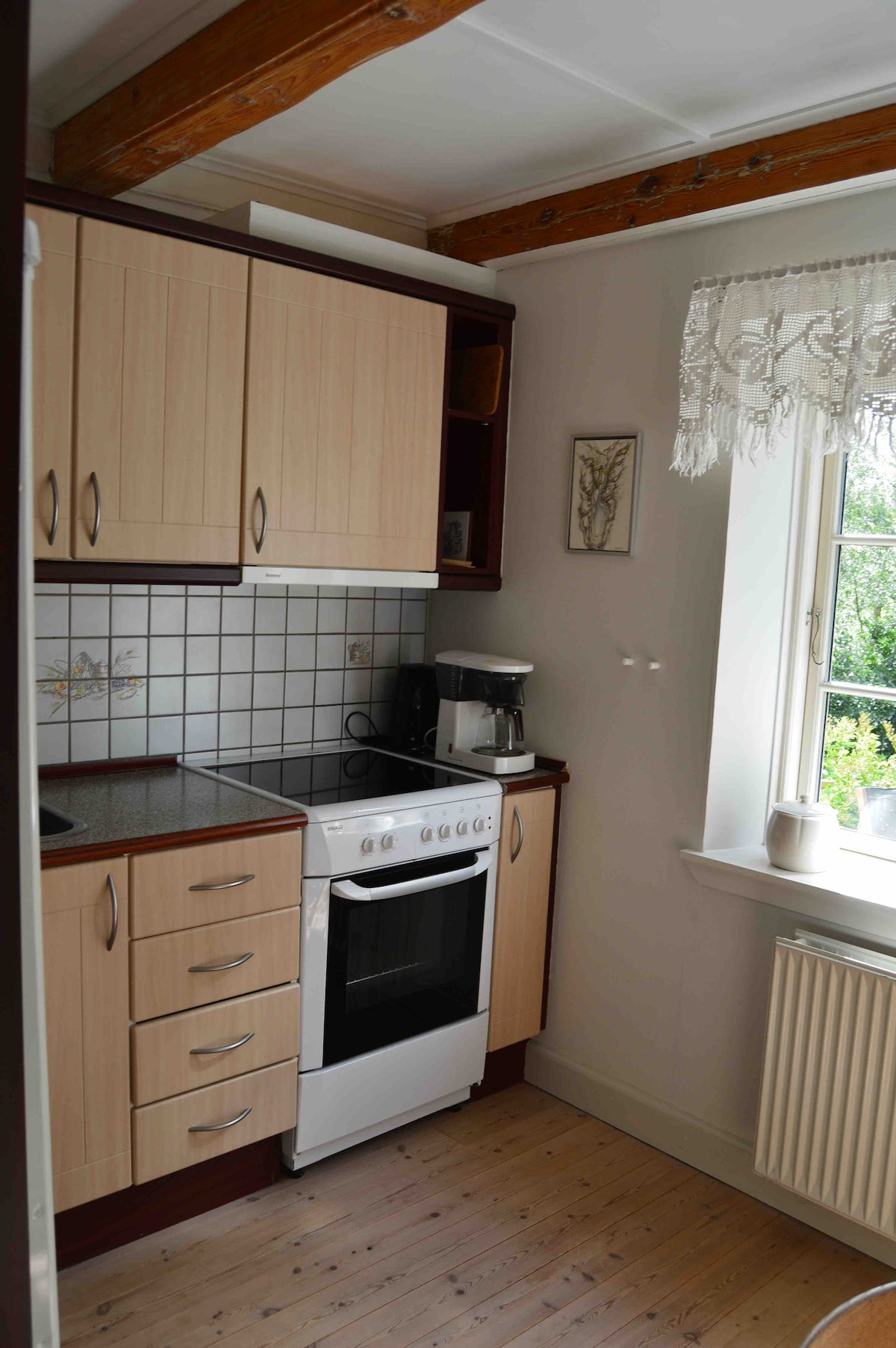 Apartma popolnoma novo obnovljena z novo kuhinjo/dnevno sobo v enem, kuhinja je z indukcijsko kuhalno ploščo, pečico na vroč zrak in hladilnik/zamrzovalnik. Velike ploščice na tleh s talnim ogrevanjem. Na koncu sobe je vhod v lepo veliko predelano stanovanje z največ 4 spalnimi prostori. Nova kopalnica s prho in straniščem. Nova spalnica z zakonsko posteljo, ki si jo lahko po želji delite z dvema enojnima posteljama. Čudovita terasa z mizo, stoli in žarom. Vrt je ograjen in ima 2 vrat, tako da ga lahko popolnoma zaprete, če imate psa. Parkiranje v bližini vrat