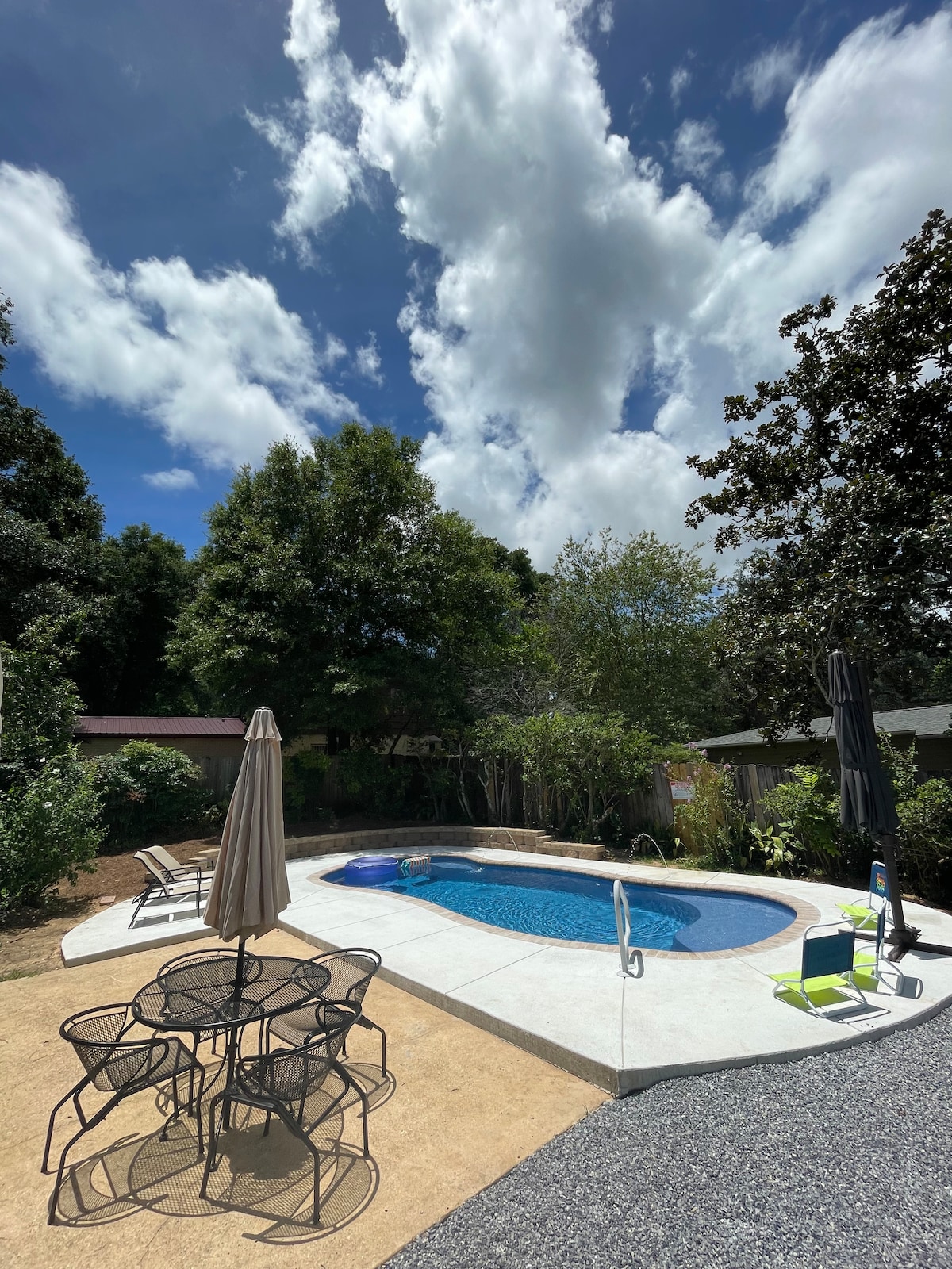 Le nekaj minut od zabaviščnega parka Fast Eddies, 5 minut stran od drugega zabaviščnega/vodnega parka Splash, 10 minut od središča mesta, 5 minut od meddržavne ceste in manj kot 10 minut od nakupovalnega središča!!! Hiša je 20 minut oddaljena od plaže Pensacola, 30 minut do plaže Perdido Key!!! Na voljo je biljardna miza, jumbo jenga, prostorno dvorišče, pokrit prostor za žar, velik žar na oglje in dovolj prostora za vašo skupino!!!!