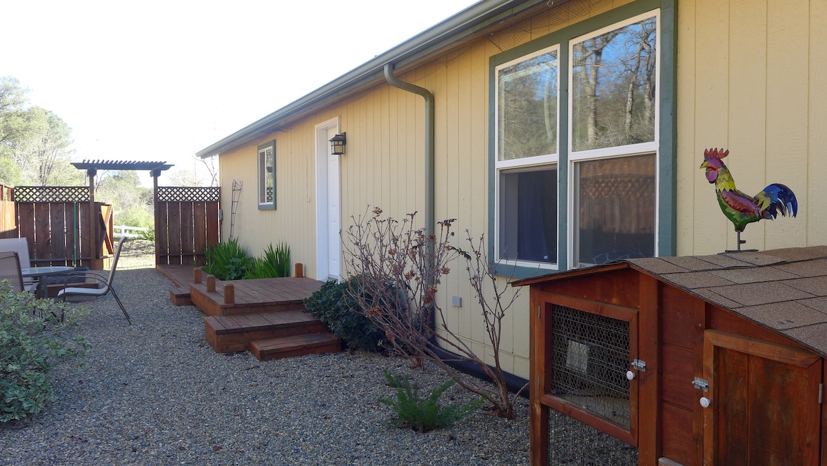 Sprostite se na terasi in uživajte v čudovitem sončnem vzhodu/zahodu nad gorami ali neverjetnem nočnem nebu. Hiša je obdana z več kot 12 hektarji borovcev in hrastov. Ta odprt studio v zgornjem nadstropju je samo vaš, ne boste ga delili z drugimi. Približno 45 minut do vhoda v narodni park Yosemite (1 ura do nadstropja doline). Spodaj lahko parkirate ali se igrate v garaži za 1 avtomobil (ogrevanje in klimatska naprava) z mizo za namizni tenis in drugimi igrami. Električni žar na terasi. Vključuje aparat za vaflje, mešanico in sirup, aparat za pokovko in pokovko. 10 minut vožnje do Maripose.