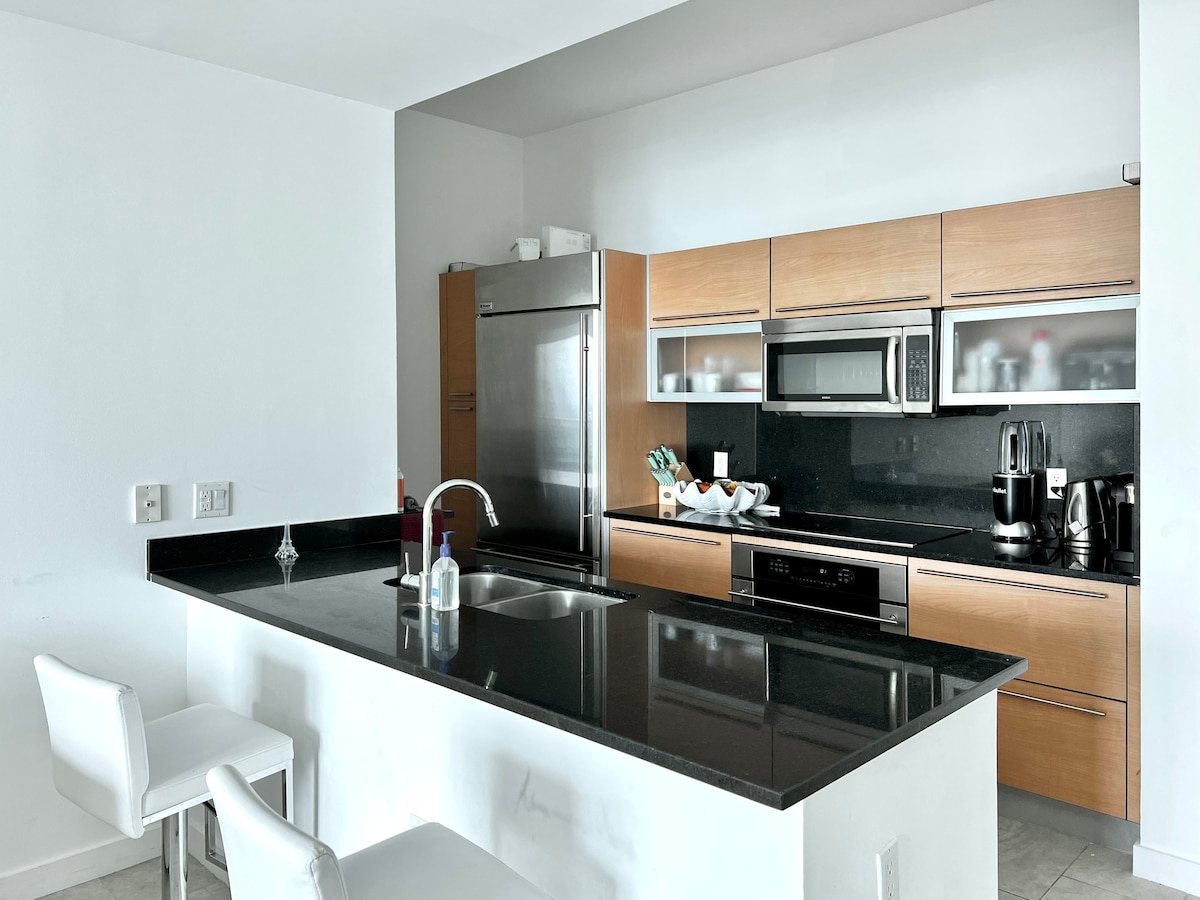 FREE PARKING! 1 Space Our home features modern furnishings, clear views of the Miami's beautiful bay and the pool. Experience a newly remodeled kitchen with stainless steel appliances, a completely remodeled modern bathroom, included is a washer & dryer, dining area, and a comfy living room. After a long day you can come back to the your master dream bedroom open the sliding glass doors and feel the ocean breeze. There are two large Smart TVs in both rooms. Expect the best during your stay!