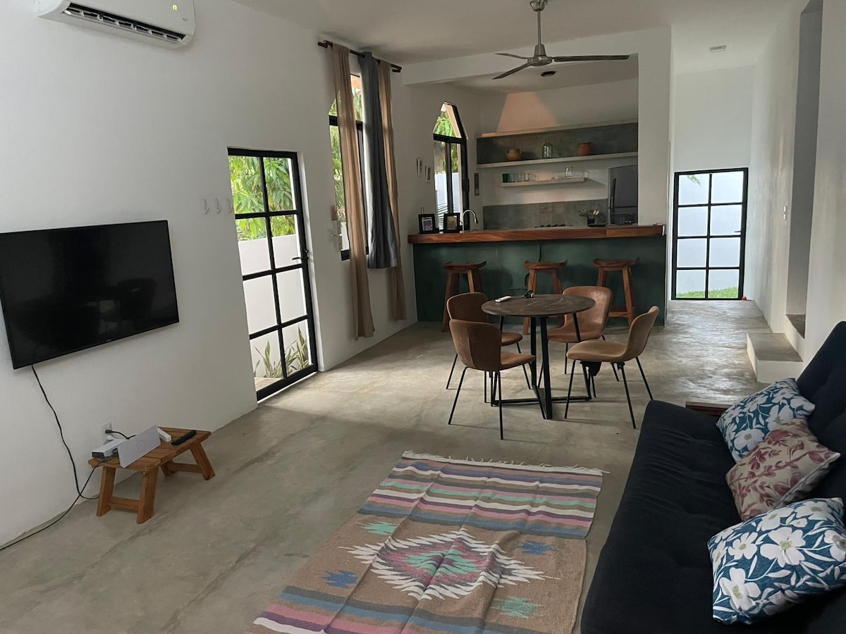 Depa amplio y luminoso en planta alta con 2 camas queen súper cómodas, A/C en la recámara y ventiladores en sala y cocina. Cuenta con cocina equipada, salita acogedora y balcón con vista a palmeras. Estás a solo 2 min de la playa y a 1 min de cafés, tiendas y restaurantes. Disfruta el patio compartido con hamacas, árboles frutales, asador y área de pesas artesanales. Ideal para relajarte, surfear o trabajar remoto con buena vibra.