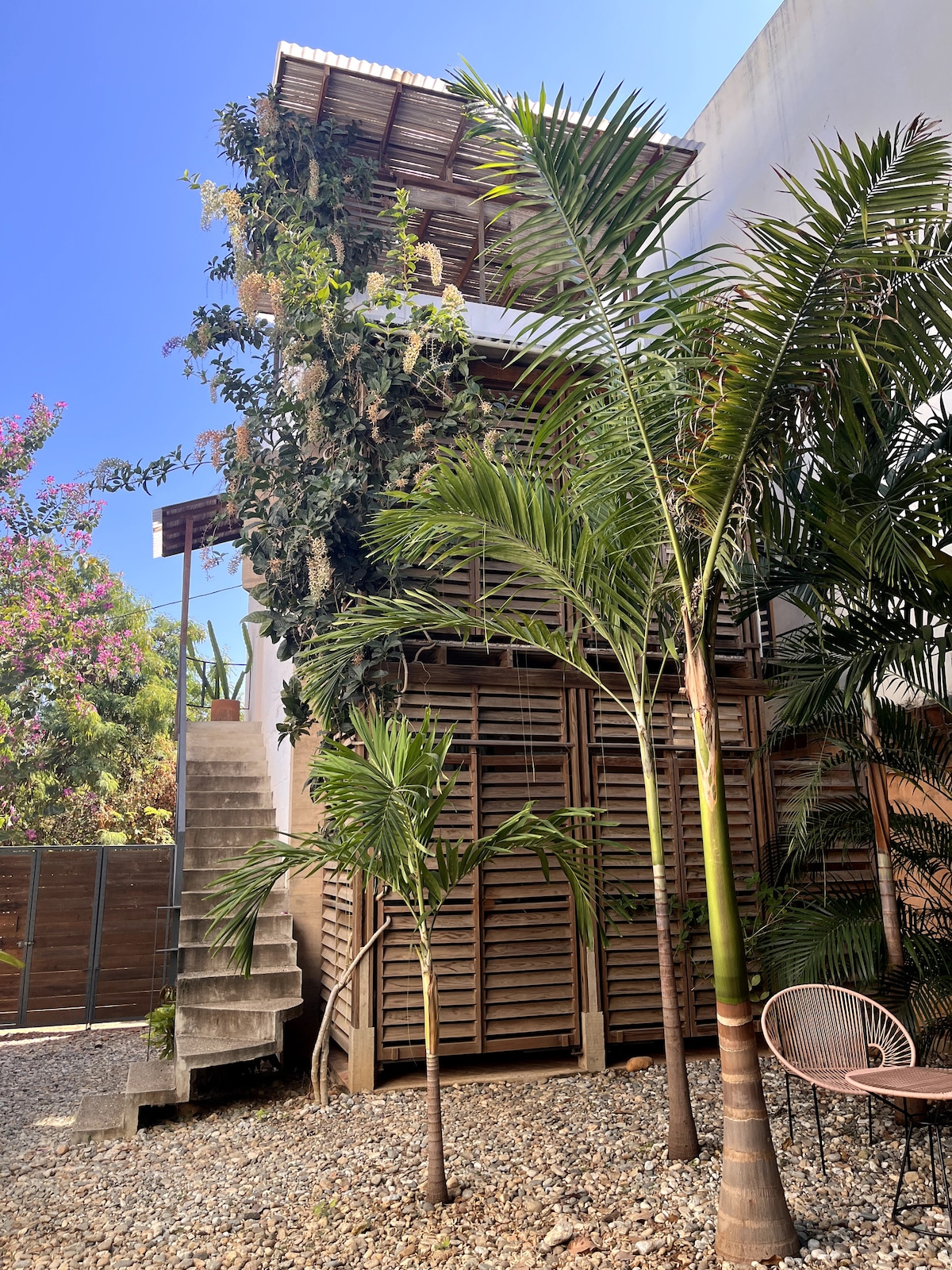 Located in Punta Zicatela, just a few minutes' walk from the beach, restaurants, and other attractions. With excellent internet both optic fibre and Starlink. Queen-size bed, AC, ventilator, kitchenette with fridge, coffee maker and water filter. A full bathroom, and a small closet. It features a balcony with a small table and two chairs, and wooden blinds with a view to the garden. Additionally, it has a private terrace on the second level, with a beautiful view, a small table and chairs.