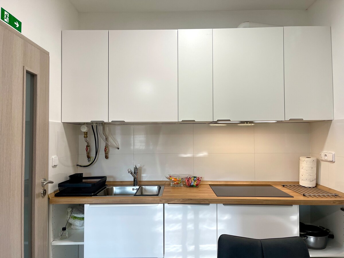 Bivajte v novem in sodobnem stanovanju s teraso v bližini Brna v središču Šlapanice. Ne glede na to, ali potujete poslovno ali si ogledujete znamenitosti, se boste tukaj počutili kot doma. Popolnoma opremljena kuhinja z indukcijsko kuhalno ploščo, pečico, pomivalnim strojem in loncem za kavo moka. Hitri internet, 4K TV, zunanje žaluzije in talno ogrevanje zagotavljajo udobje. Kopalnica je opremljena s pralnim in sušilnim strojem ter sušilcem za lase. Z javnim prevozom ste v središču Brna v 25 minutah, letališče pa v 10 minutah z avtomobilom.