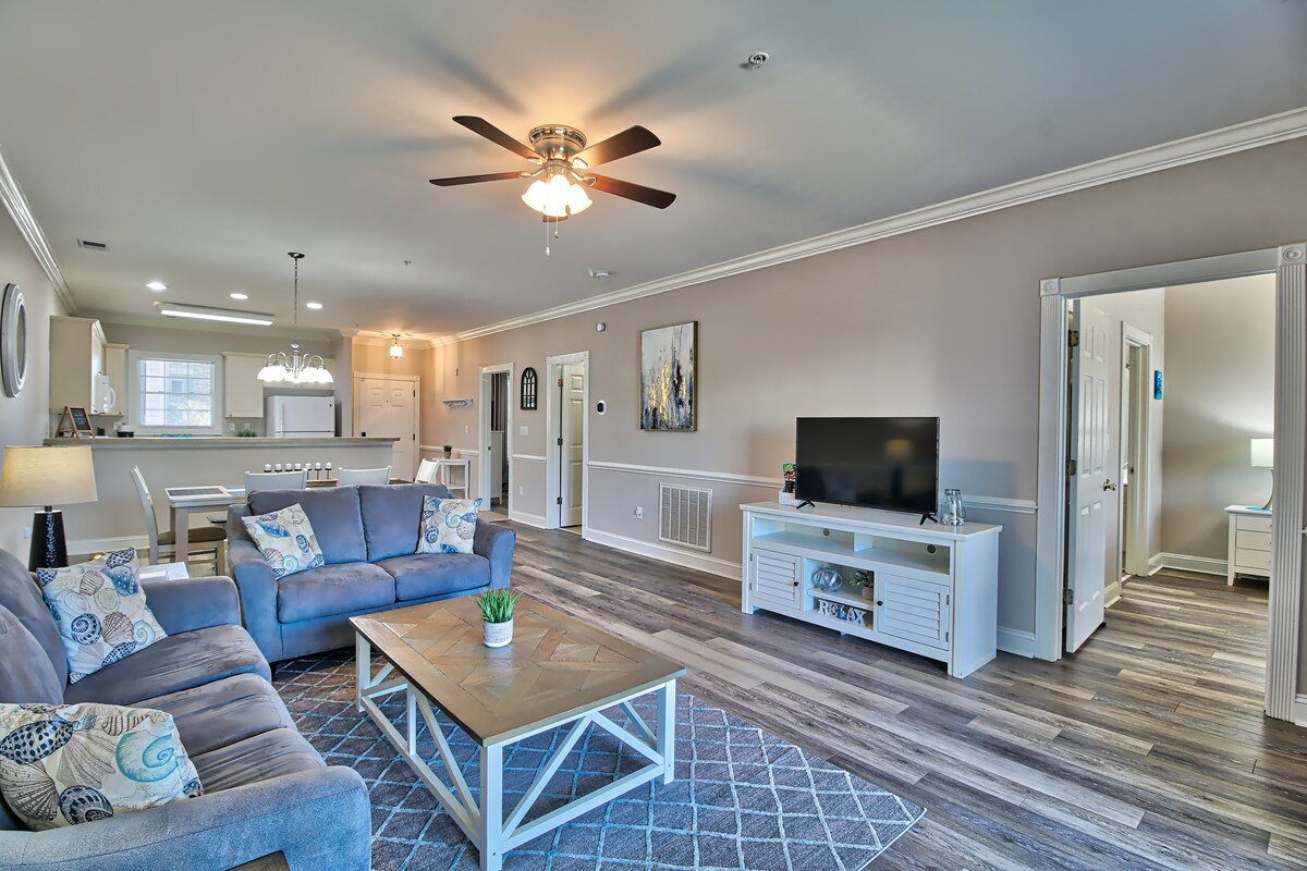 Bivajte v tem stanovanju s 3 spalnicami in 2 kopalnicama v najvišjem nadstropju v Myrtle Beachu s pogledom na jezero, ki vključuje eno sobo z zakonsko posteljo velikosti King in dve sobi z zakonsko posteljo velikosti Queen ter z vstopno prho. Uživajte v popolnoma opremljeni kuhinji, 55-palčnih pametnih televizorjih, brezplačnem brezžičnem internetu, pralnem stroju/sušilnem stroju in zasebnem opremljenem balkonu. Plaža je oddaljena 5 minut, Broadway at the Beach, trgovine, restavracije in najboljše znamenitosti pa 4 minute. To stanovanje je prostorno in udobno za družine, izlete na plažo in skupinske oddihe ter je popolna domača baza za spomladanske in poletne počitnice v Myrtle Beachu.