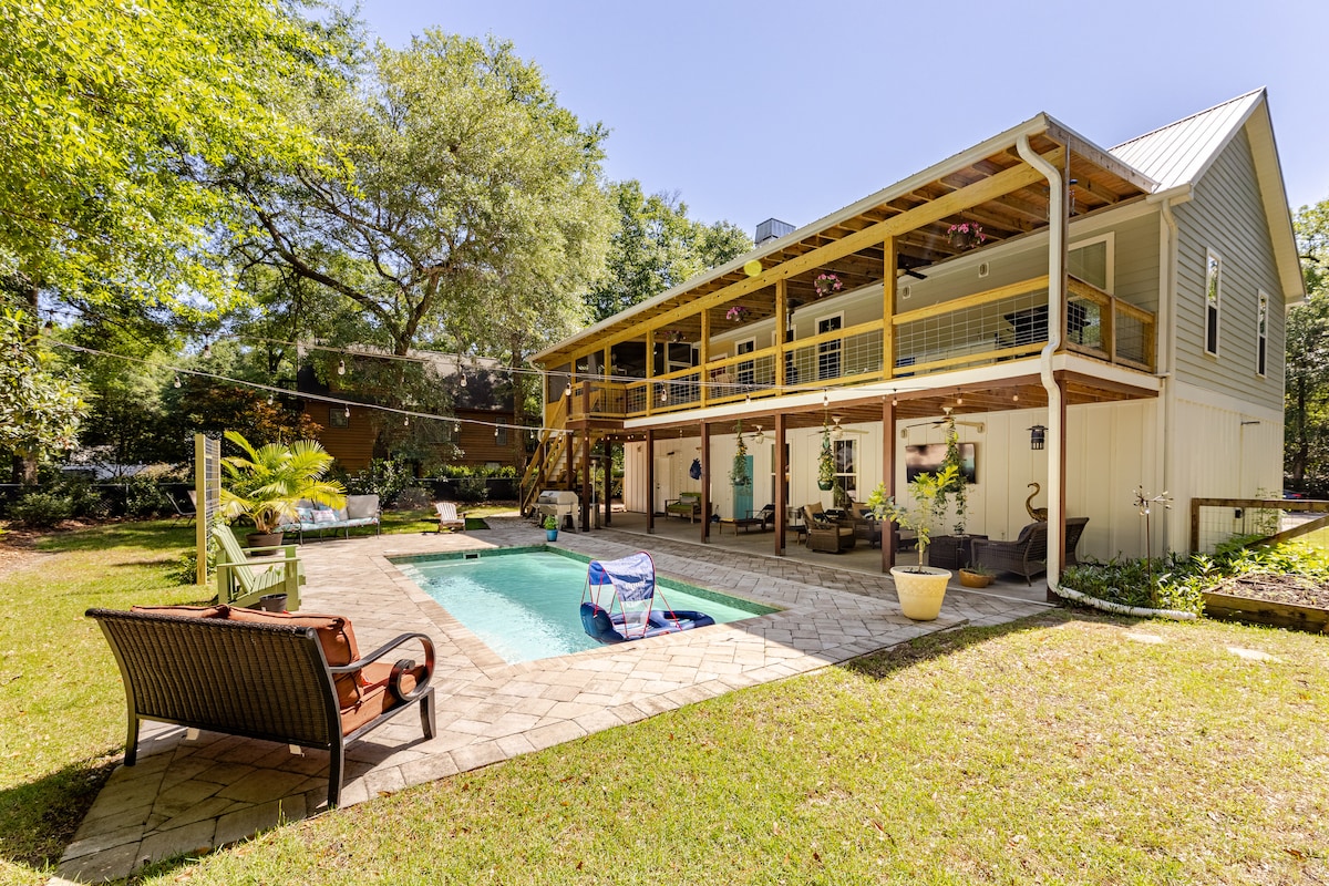 Charming 5-star home; WELCOME SNOWBIRDS SEPT-APRIL 45% discount. Huntington Beach (FREE pass) and Brookgreen just 5 mins away! Back yard oasis w/in-ground pool (seasonal) 9’ ceilings, hardwoods/rugs. Airy but cozy. 2160 sf & 2 living areas - one level. Bedrooms: 1 K BR w en suite; 2 Q BRs w shared full double-vanity BA. Fully-equipped K w island. Quiet country lane yet 5 mins. to restaurants & shops of Marshwalk. Relax on porch w rockers and swing. No motorcycles. Yes to 35 lb dogs (max 2)