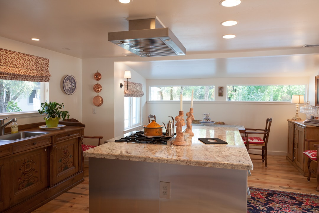 Pine antiques and floor, mid-century modern, marble bathroom and 2 bedrooms. Open kitchen and dining room. Farm tables on 2 decks in summer and 3 french doors. Orchard and 100-year old olive trees. Private gated entrance and 2-acre property fully fenced. Locally made fresh croissants. Cafe Collage, operates Thursday-Sunday from 5-8 PM, on property for take-out and private events, in a separate building. Monday-Wednesday you have the property to yourself.