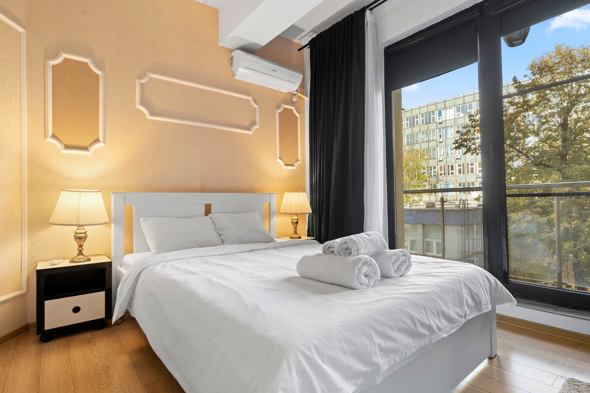 Spacious luxury 40 sqm studio in the heart of Bucharest, just steps from Old Town Bucharest. Recently renovated, the apartment features elegant decor, a comfortable queen-size bed (180×200 cm), a stylish sofa, a cozy balcony, a large fully equipped kitchen and a spacious bathroom with rain shower. Hosted by a Superhost with over 7 years of experience. Metro right next to the building. Coffee shop, cake shop, mini markets, fast food, ATM and currency exchange on the ground floor.