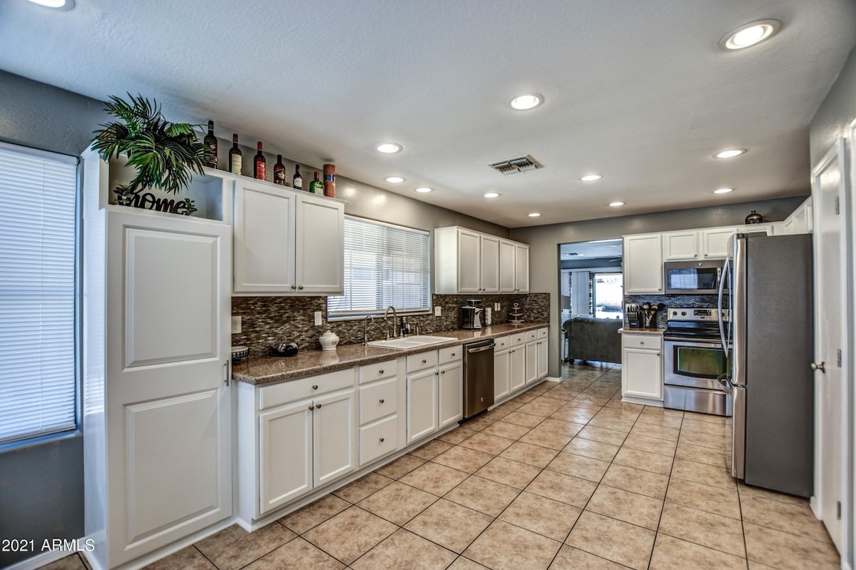 Naše bivališče se nahaja v mirni soseski in je sodobna dvosobna enota z 2 kopalnicama, ki obljublja udobje, slog in vso opremo, ki jo potrebujete za nepozabno bivanje. Ne glede na to, ali ste v mestu poslovno ali zaradi užitka, je ta suita zasnovana tako, da je vaš osebni oddih v osrčju Arizone. Zavedamo se, da so hišni ljubljenčki družinski. Zato sprejemamo vaše kosmatinčke.