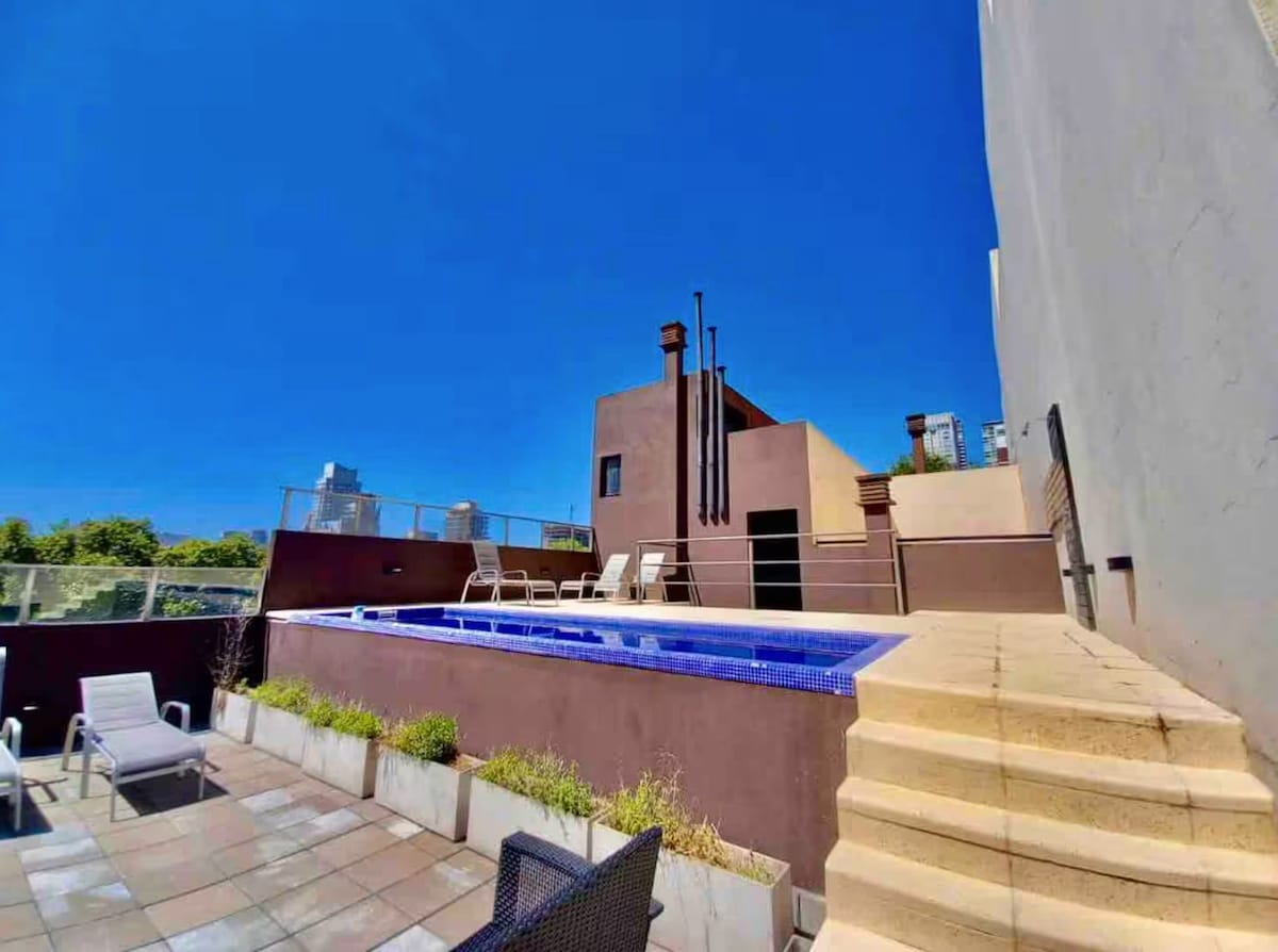 Spektakularno stanovanje, prostorno in svetlo z zasebno teraso, bazenom in žarom. V celoti opremljeno in urejeno, da bo bivanje čim bolj prijetno. Nastanitev se nahaja v zgornjem nadstropju sodobne stavbe v Palermo Sohu, enem najvarnejših območij z odlično gastronomsko in kulturno privlačnostjo. Idealno za pare, ki iščejo mir, udoben počitek in uživajo na čudoviti terasi s čudovitim razgledom.
