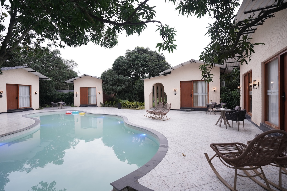 Just 2 hrs from NCR, A farmhouse comprising of Oasis suite and a cozy log hut, 40+ lush mango trees and pure, oxygen-rich air. Refresh with a tube well bath, enjoy homemade meals and unwind by a bonfire under the stars. For entertainment, we offer karaoke and projection cinema. With hi-speed Wi-Fi, CCTV security, and exclusive service staff, your comfort and safety are assured. Accessible via a motorable road with secure parking, this pet-friendly haven is your ideal escape into nature.