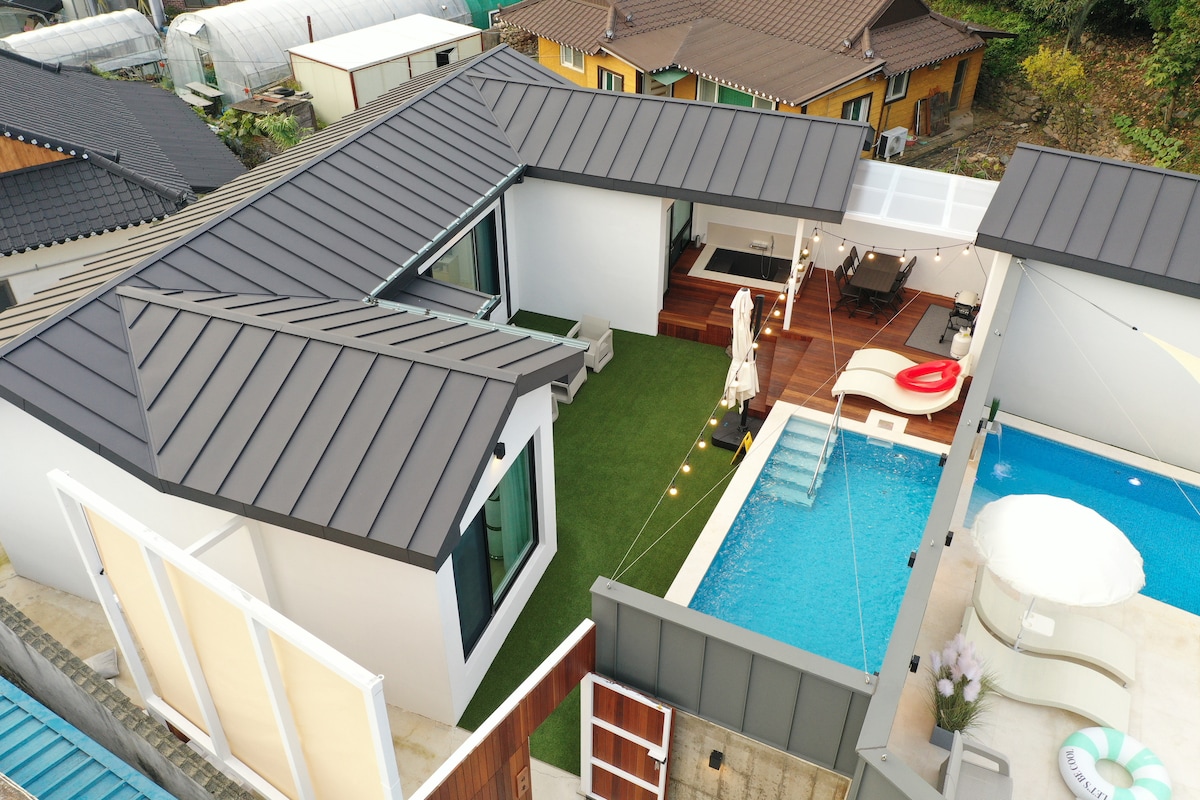To je zasebni penzion Hwangto Brick Pool Villa, zgrajen v mirni vasici v Gyeongjujuju. V prihodnje je na voljo travnik, poln sončne svetlobe. Oglejte si sezonska drevesa in cvetje s svojimi otroki. Na vrtu nudimo tudi zelenjavo. [Ogrevani bazen s štirimi sezonami] Na voljo je ogrevan bazen, kjer lahko otroci plavajo in se igrajo v vodi. Poleti široko odprite zložljiva vrata in jih uporabite kot notranji bazen, ko je mrzlo. * Strošek ogrevanja tople vode 50.000 KRW/1-krat (na voljo je plačilo na kraju samem) - Vnaprej se obrnite na nas za vroč bazen. * 30.000 KRW za neogrevano vodo [Hwangto Brick House] Celotna hiša je zgrajena iz okolju prijazne rdeče glinene opeke. Udobno spite v zdravi in osupljivi hiši. - 1 dnevna soba, 3 sobe, 1 kopalnica [Otroška igralnica] Otrokom je na voljo igralnica s predpražniki, kjer se lahko varno igrajo. [Žar] Možen je zunanji žar na oglje. * Oglje 30.000 wonov ločeno (na voljo je plačilo na kraju samem) [Kuhinja] Zagotavljajo prostorno in priročno kuhinjo. - Indukcijska kuhalna plošča, čistilec vode, čistilnik vode, hladilnik, kuhalnik za riž, lesena jedilna miza za 6 oseb, jedilni pribor, odpirač za vino itd.