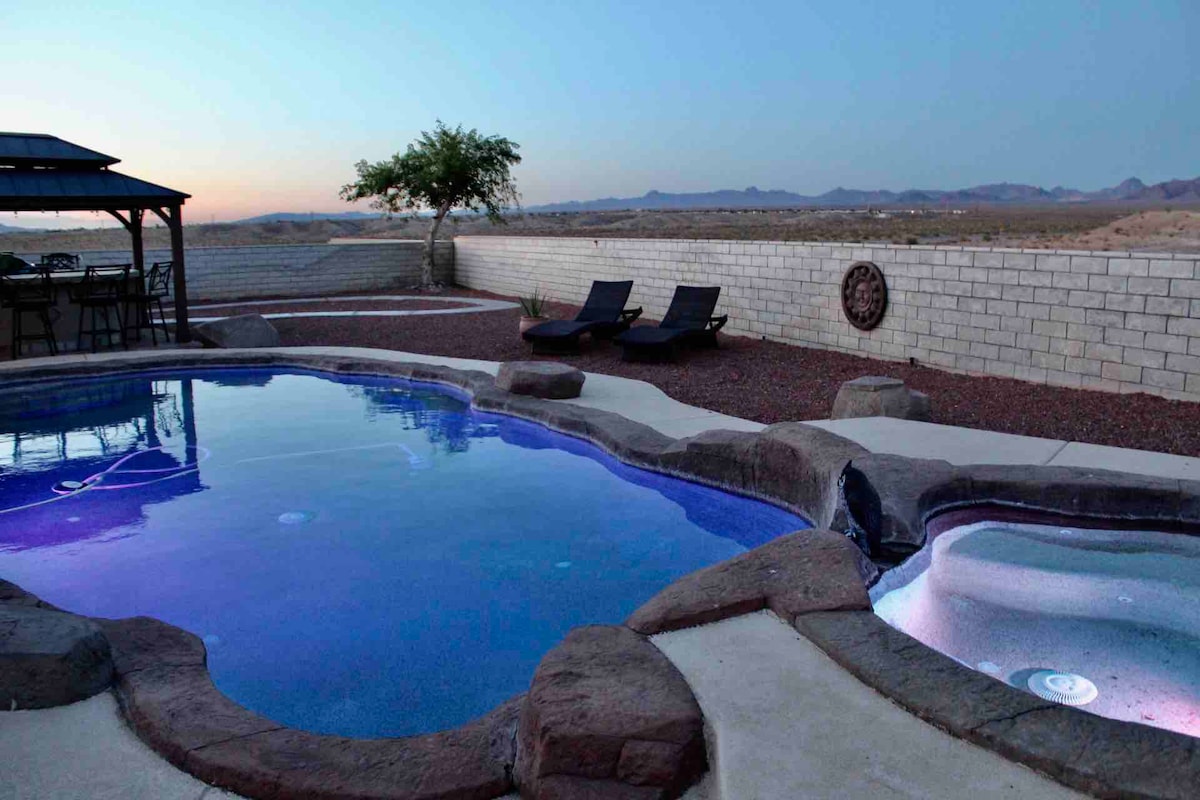 Uživajte v prijetnem kopanju v bazenu in spa centru v tem osrednjem prenočišču, ki se nahaja manj kot 4 milje do reke Colorado, igralnice Avi, Bullhead, igralnic Laughlin in številnih igrišč za golf! Dvorišče ima tudi žar in ognjišče, kjer lahko uživate! Prenočišče ima vso opremo za kuhanje in družinski čas! 2 pametna televizorja za vaš užitek in veliko postelj za goste! *Bazen ni ogrevan*