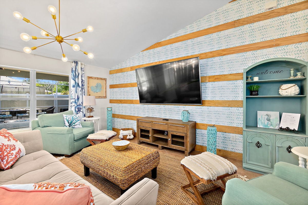 Novo prenovljeno prenočišče ob prednjem bazenu v bližini evropske vasi, kolesarskih poti in plaže v Palm Coastu. Naše prenočišče je sestavljeno iz treh spalnic in dveh kopalnic, velike družinske sobe in jedilnice z mizo, ki se spremeni v namizni tenis in biljardno mizo. Pridite in uživajte v življenju na Floridi, medtem ko se sprostite ob bazenu s pogledom na kanal s slano vodo ali z ribolovom na našem pokritem zasebnem pomolu. LBTR# 33043