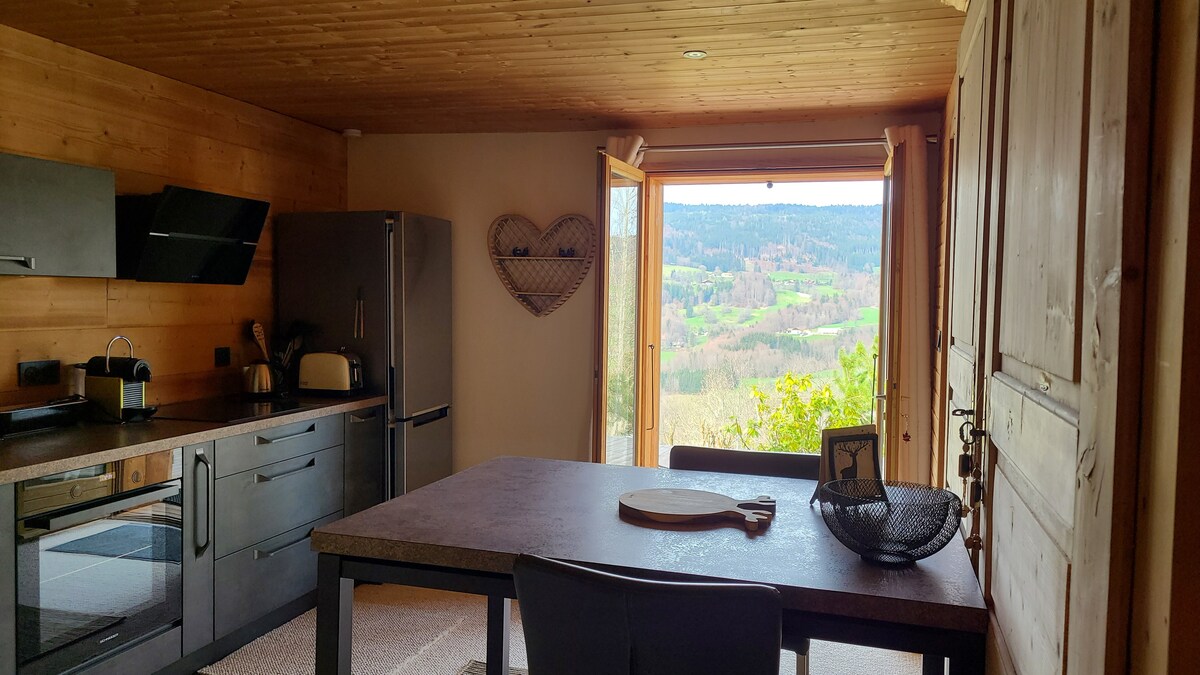 Venez vous ressourcer dans ce studio au rdc d'un chalet en bordure de foret, au calme, avec une jolie vue sur la vallée verte. Le studio ainsi que toute la propriété sont entièrement non fumeur. Notre chalet se situe en bord de route, mais elle est peu fréquentée car nous sommes en bout de commune. Nombreuses balades à pied ou en vélo depuis le chalet, et encore plus en vallée verte! Possibilité de faire une séance de sauna extérieur. N'hésitez pas à nous contacter pour en savoir plus.
