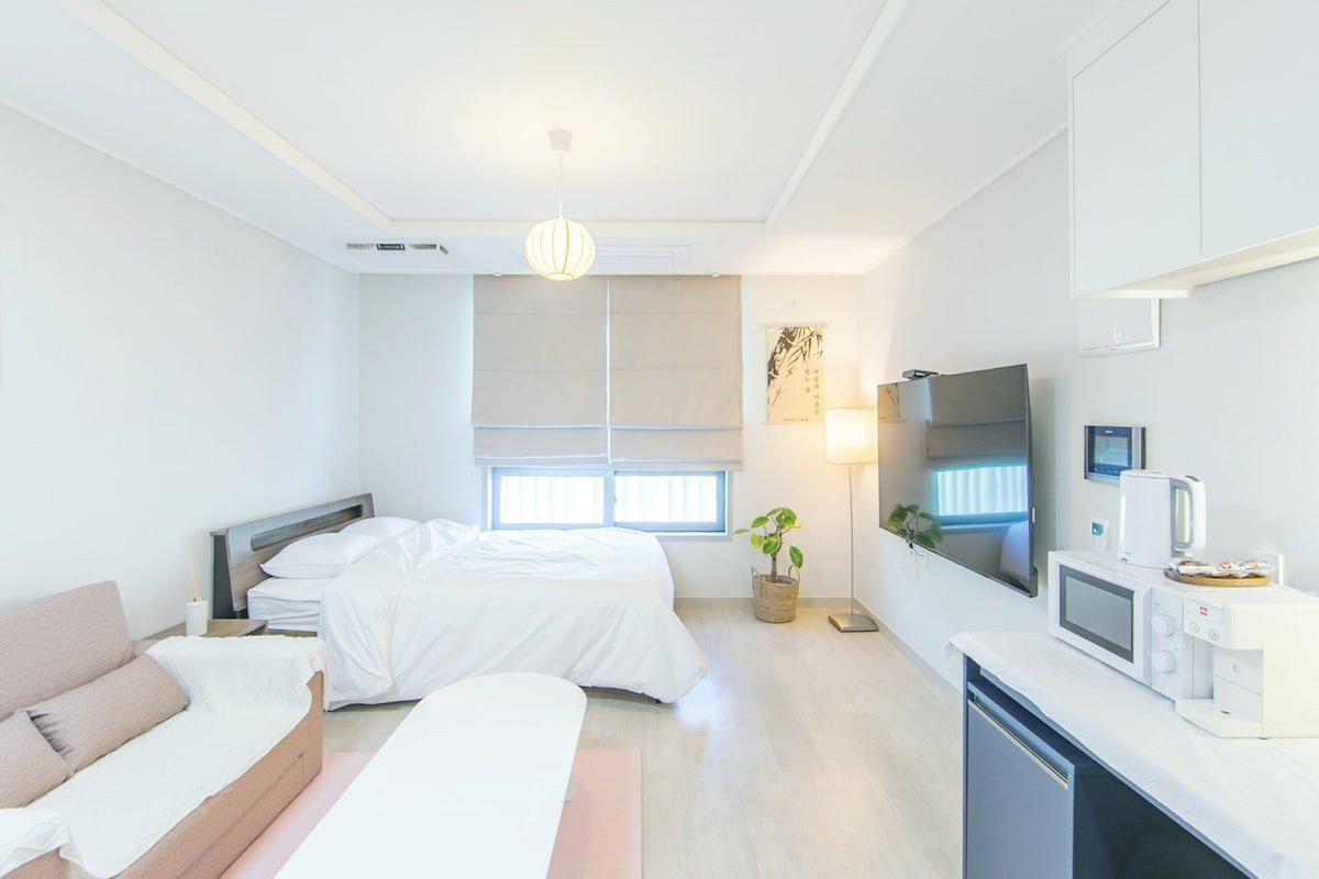 @stay8usanhang is a space overlooking Busan Port, thoughtfully designed to offer comfort and inspiration. Every detail, from music and fragrance to ambiance, interior, and bedding, has been carefully curated to enhance your stay. -Sky bridge connected to Busan Station (5-minute walk) -1 Super King bed, 3 Super Single beds Ocean-view bathtub (spa-ready) - Fully equipped / ideal for family travelers 50-inch large TV with Netflix, YouTube, OTT, and broadcast channels Bang & Olufsen speakers