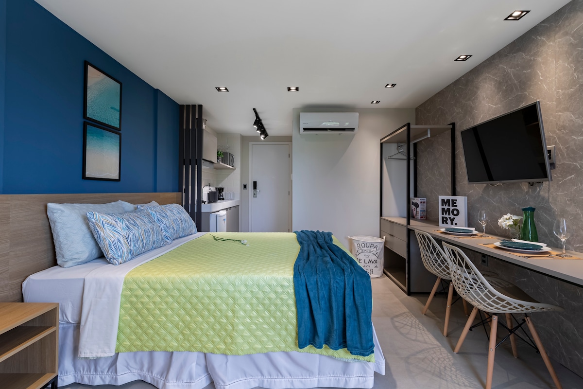 NOVO stanovanje, zasnovano za vašo najboljšo izkušnjo na eni najlepših plaž v João Pessoi. NISMO HOTELSKA VERIGA! Imamo balkon s pogledom na plažo Cabo Branco in na voljo boste imeli: - posteljnina in kopalna posteljnina, - Wi-Fi - Smart TV - Popolna kuhinja (minibar, štedilnik, mikrovalovna pečica, aparat za kavo za espresso, aparat za sendviče, krožniki, kozarci, kozarci, jedilni pribor itd.) - klimatska naprava, - skupni prostor (bazen, restavracija, pralnica, pokrita garaža, ledomat) - 24-urna recepcija