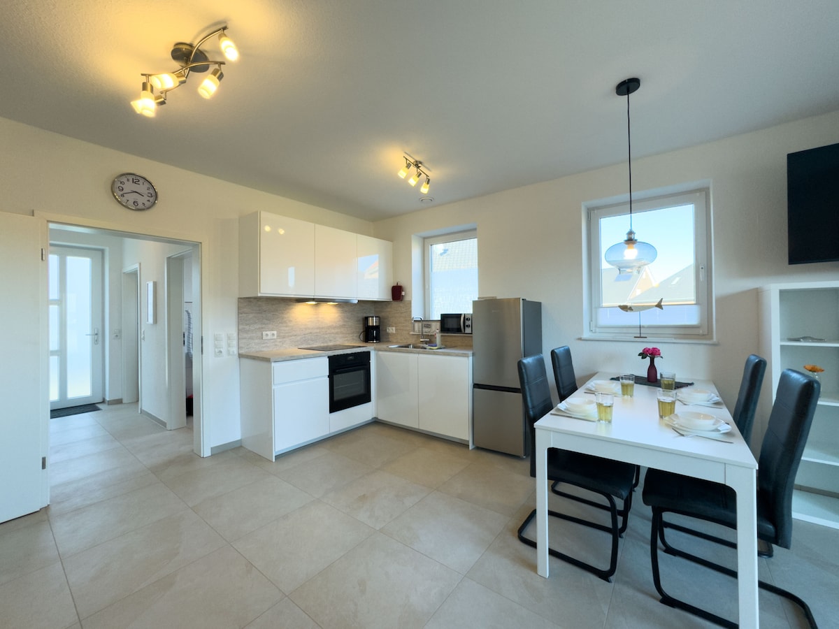 Visokokakovostna in okusno opremljena počitniška hiša Tillmann z veliko lesa ima približno 75 kvadratnih metrov bivalnega prostora in se nahaja v hoje od nasipa. V pritličju vstopate s hodnika v novo, popolnoma opremljeno kuhinjo, ekskluzivno kopalnico s prho in straniščem ter vabljivo dnevno sobo. Dnevna soba je lepo urejena in vas vabi, da se počutite dobro in se sprostite, prav tako pa tudi prostorna jedilnica.
