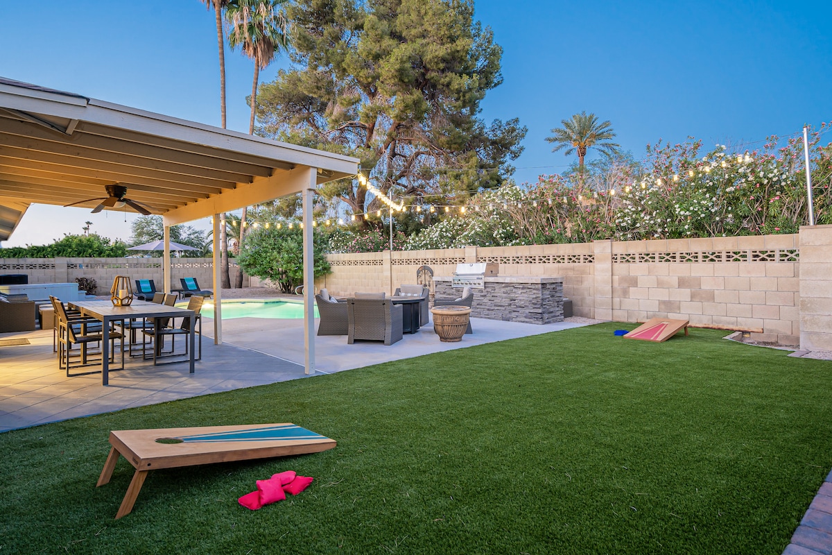 This home is in the center of Scottsdale just minutes from Old Town, Talking Stick Casino, Spring Training, parks & walking paths, shopping, and more! The backyard features a pool, hot tub, built-in grill, dining area, and turf. Enjoy the incredible sunsets under a sea of string lights and a cozy fire pit. This family-friendly home comes stocked with board games, lawn games, live TV, and high-speed wifi. Our guests love the comfort of this home, a perfect place to relax, unwind, and have fun!