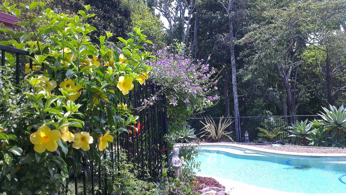 Hišnim ljubljenčkom prijazno prenočišče na 35 hektarjih, samostojna/samopostrežna enota, luksuzni apartmaji na zlati obali, Tweed Hinterland, Kingscliff, Byron Bay v regiji Severne reke Novi Južni Wales. Savna z masažno kadjo in ogromnim bazenom s pasjim jezu veliko prostora, da se lahko psi odmaknejo od vrveža ob sprehajalnih poteh v deževnem gozdu. Upoštevajte, da so hišni ljubljenčki dodatni 20 USD na noč. Podrobnosti o kreditni kartici morajo biti na voljo ob prihodu za stroške in kot varnost za kakršnokoli škodo in/ali dodatno čiščenje.
