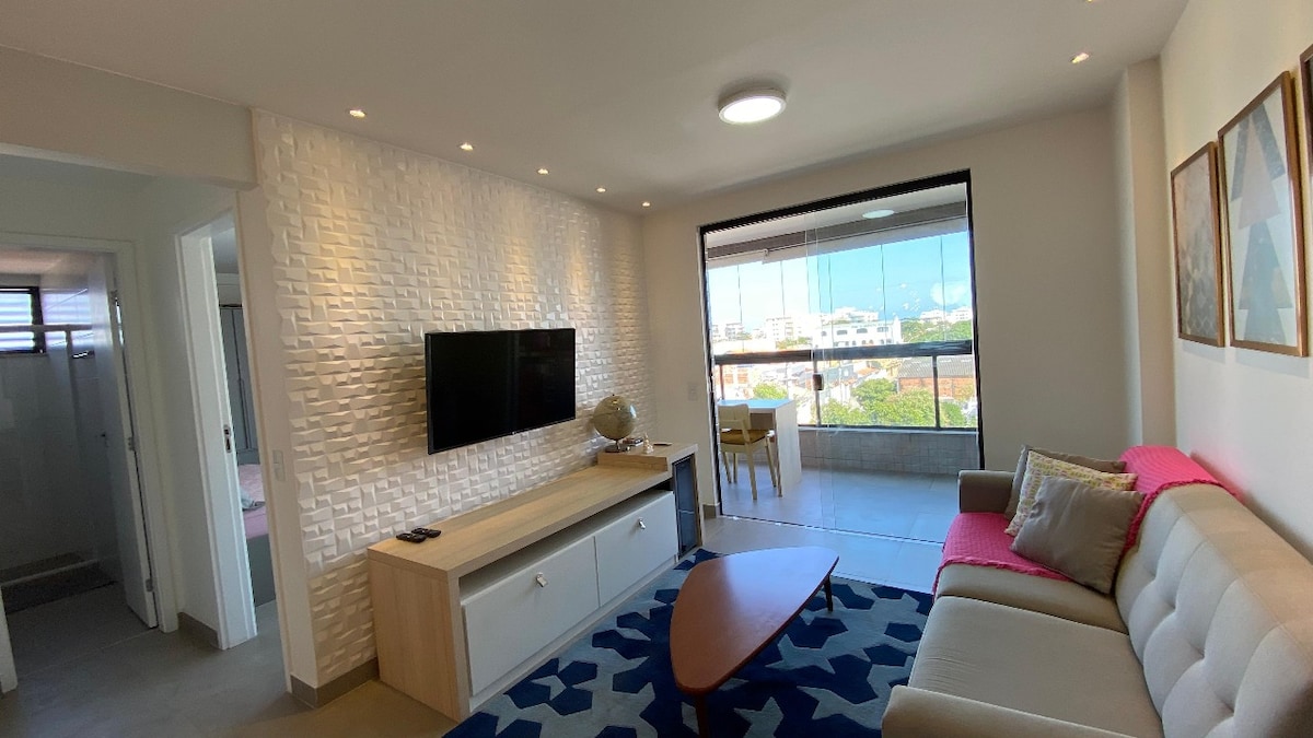 Naše prenočišče je zasnovano tako, da boste imeli veliko udobja in udobja pri skrbi za goste. Stanovanje 401 je luksuzno stanovanje s površino 38 m² in velikim balkonom s pogledom na kanal Itajuru. Od gastronomskega centra je 100 mts z več restavracijami,bari z živo glasbo in 700 mts Praia do 🏖️ Forte. Zdaj ima pokrito parkirišče, ki je vključeno v samo stavbo.