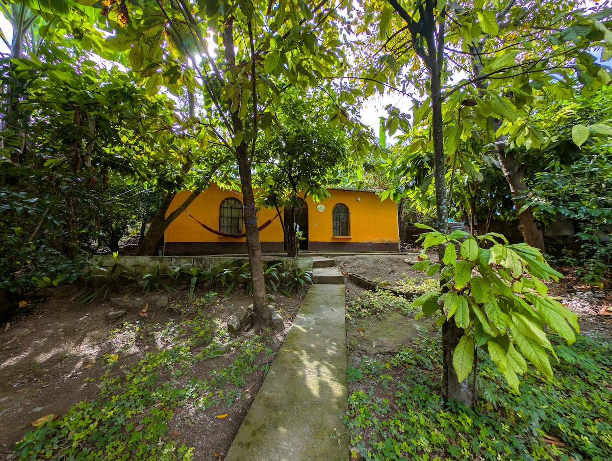 Venez vous détendre au calme dans une forêt de cacaoyer avec une vue magnifique. Le logement est isolé, 15 min de marche. Équipé d'une cuisine complète (assiettes, couvert, poêles) plaque au gaz, eau chaude avec baignoire vue sur la vallée. Lit double avec sa moustiquaire. Filtre à eau Berkeley, eau de source (top qualité) Hammock. Toilette sèche Internet wifi rapide. Repas sur demande dont petit déjeuner typique avec tortillas artisanales, café, fruits, œufs de ferme, boissons fraîches.