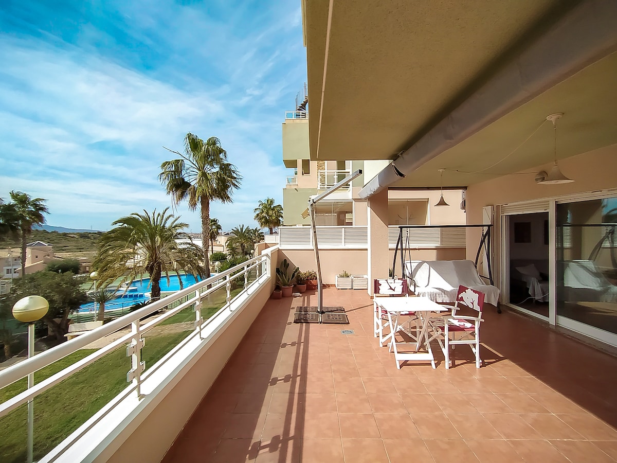 Espectaculares atardeceres. @vistaslamanga en Instagrm Aire acondicionado y vistas en todas las habitaciones y salón. Parking privado. Muy luminoso, Km-3 La Manga Playa semiprivada y cerca campos golf Dos piscinas, acceso directo a la playa Deutsch, Englisch, frances Hasta 3 dormitorios , 5 camas, 2 baños y 1 aseo. Cocina, salón, terrazas verano e invierno. Totalmente amueblado, TV y wifi Urbanización cerrada, portero 24 h