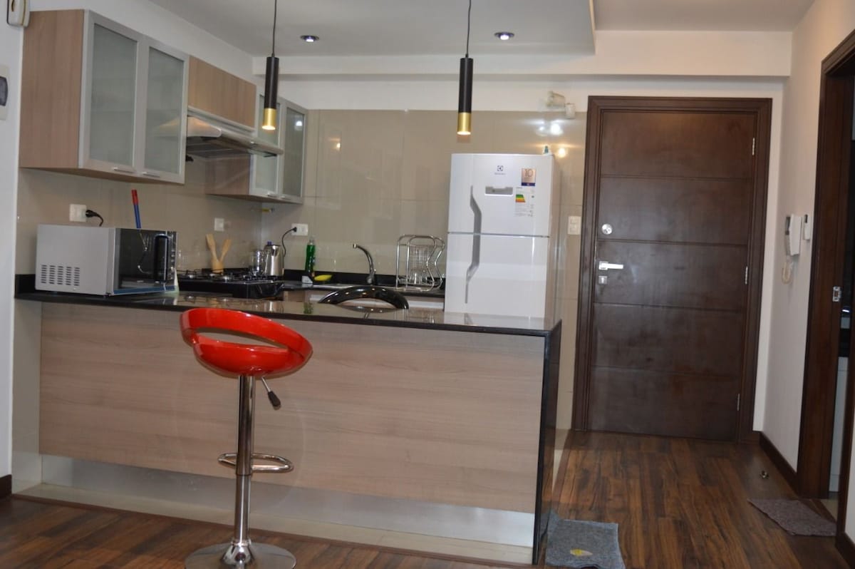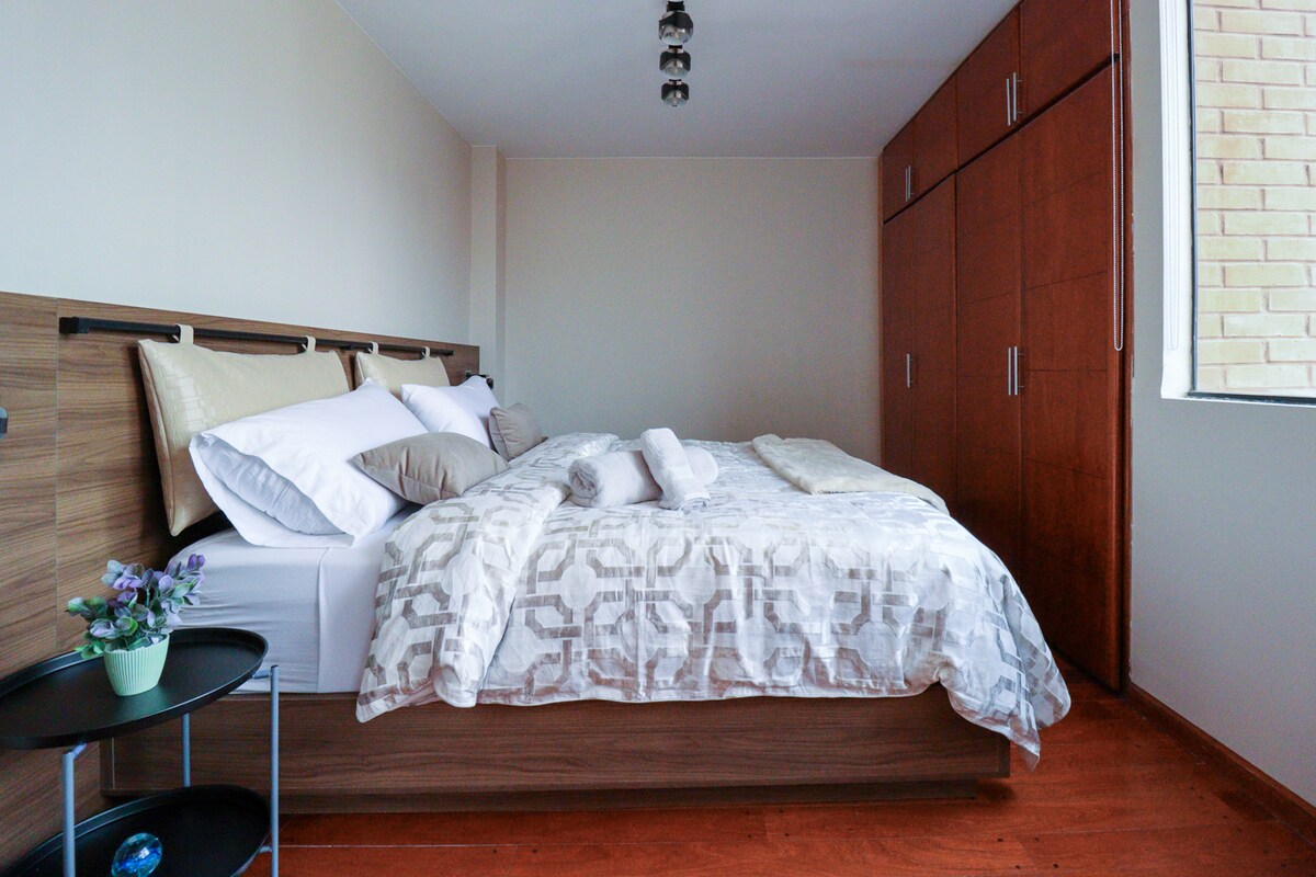 El departamento es encantador! La habitación cuenta con material de línea hotelera para un descanso confortable, la cocina y sala cuentan con todas las comodidades necesarias. La iluminación es perfecta! El departamento se encuentra en una zona completamente segura y centrica, a pasos de supermercados, embajadas, hospitales, bancos, cine, estaciones de teleférico, cafeterías, centros comerciales, bares de rock, discotecas, etc.