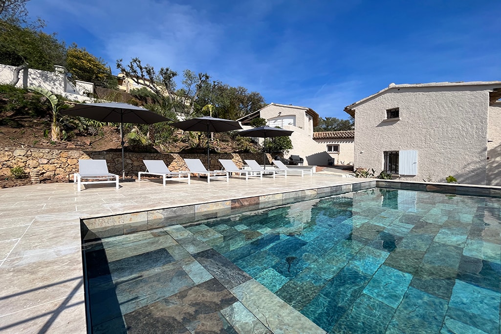 Stunning boho-chic single-story villa with an infinity pool (heated from April to October), located in Les Issambres. It offers a breathtaking 180° view of the Bay of Saint-Raphaël, the Estérel Massif, and the Alpes-Maritimes. Situated in a very quiet neighborhood, it is just a 10-minute walk from one of the most beautiful coves in Les Issambres: La Calanque Bonne Eau
