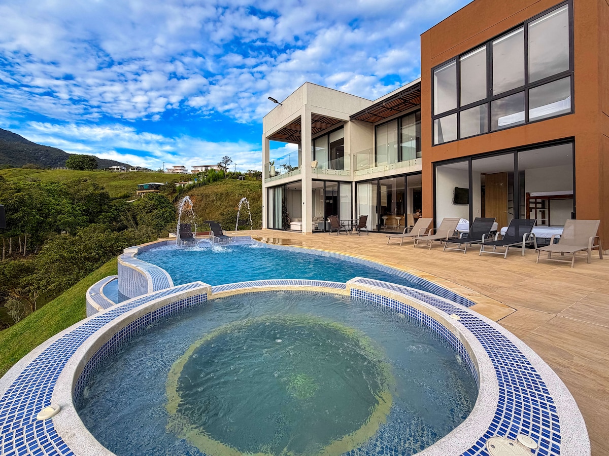 Wake up to unobstructed views of Lake Calima from a brand-new 890 m² modern villa. Everything you need to truly disconnect: ✔ 200 Mbps Wi-Fi + coworking area ✔ 2 pools: conventional & natural river-fed ✔ Jacuzzi with panoramic lake views ✔ BBQ zone, bonfire & outdoor kitchen ✔ Free parking for 17 vehicles ✔ 24/7 on-site resident caretaker ✔ Sleeps up to 26 guests 5 min from Nautical Club · 12 min from Darién village.