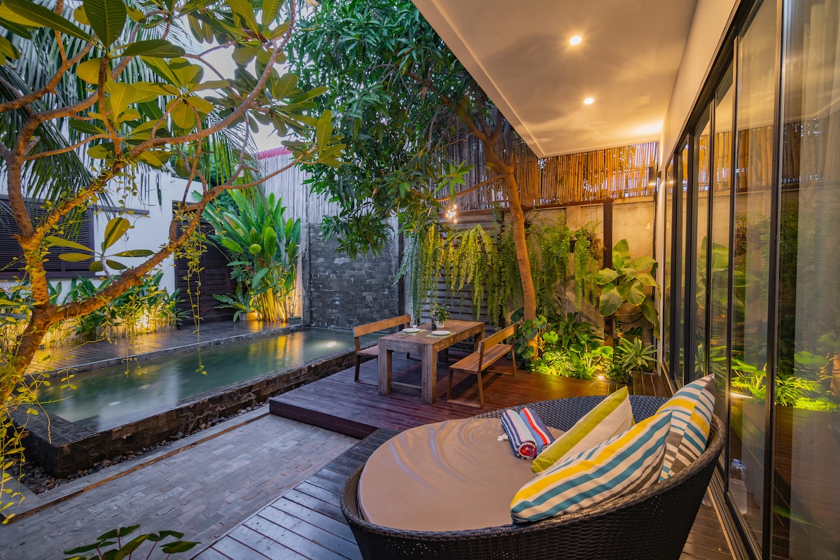 Lepo zasnovana, prijetna, zasebna in sproščena vila v osrednjem Siem Reap - samo 3 minute vožnje tuk tuk ali 10 min hoje do Pub Street (Old Market Area). Naše mesto ima svoj bazen in lepo dvorišče, ki vas bo zabaval med bivanjem. V vili se nahaja velika hotelska postelja in posteljnina, ki vam bo zagotovila odličen počitek po dolgih dneh, ko boste raziskovali vse, kar ponuja Siem Reap. Vila ima ogromno en-suite kopalnico z deževnim tušem.