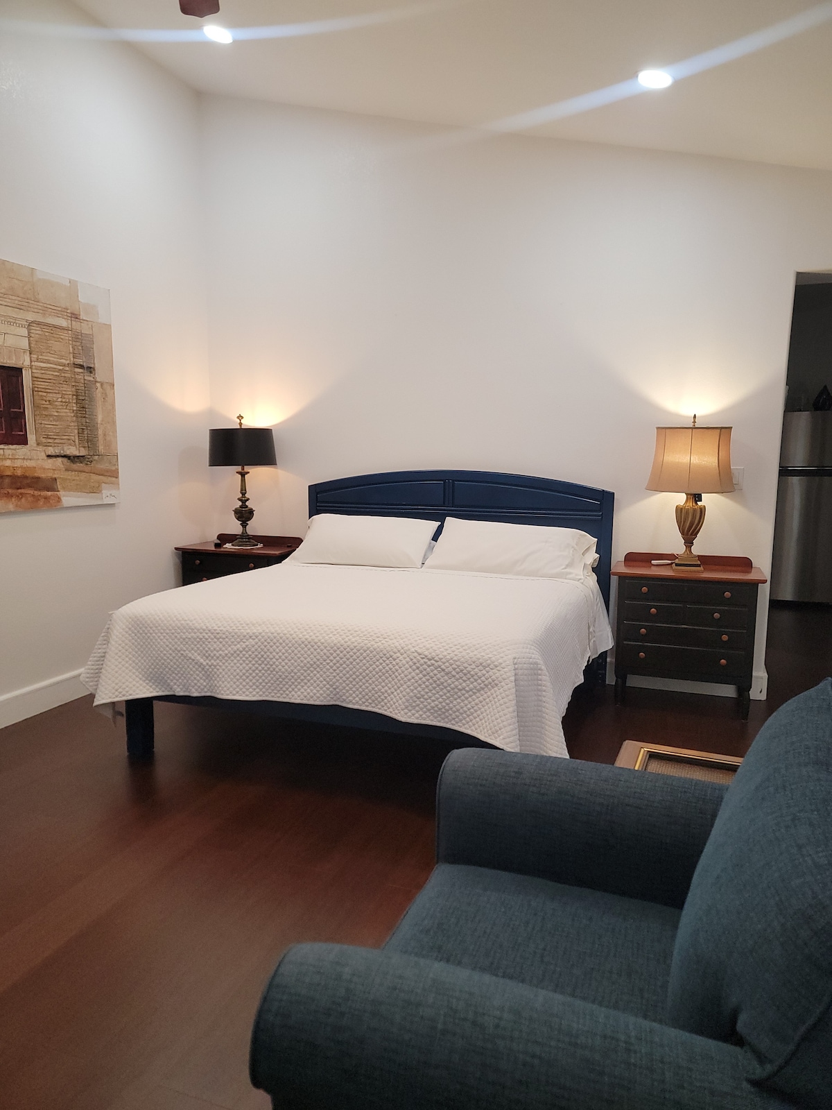 Velik ,čist in svetel prostor za delo ali prosti čas . Miza in stol , Wi-Fi, kabelska televizija . Zakonska postelja , nočne omarice in svetilke, stojalo za oblačila, likalnik in likalna deska . Dnevna postelja za sprostitev ali nastanitev druge osebe. Čajna kuhinja , predel za pripravo, poln hladilnik , plinski štedilnik . Mikrovalovna pečica , Keurig in kuhinjski pripomočki . Zasebna kopalnica s prho . Zasebni zunanji prostor za sedenje, dvorišče zaprto. Zunanji plinski žar . Popusti so na voljo po tedenskih in mesečnih cenah . Prijazno do psov,brez mačk.