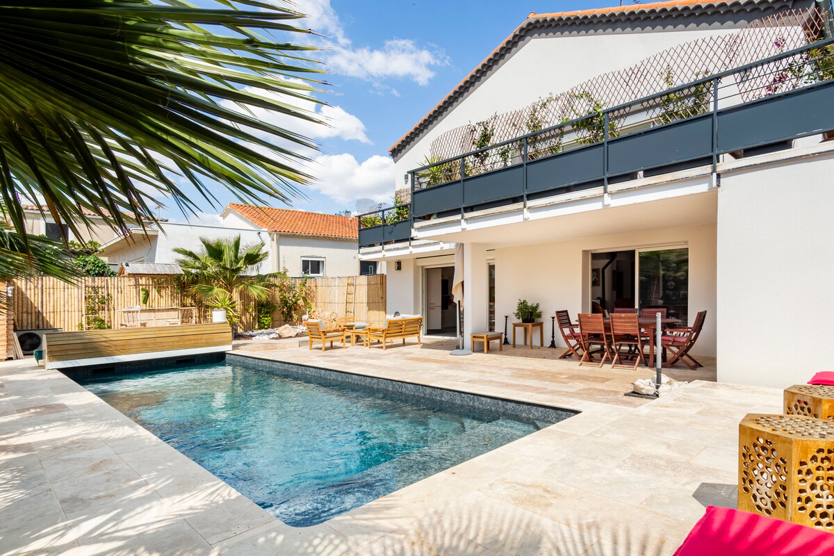 Villa Vanille. Magnifique maison d’architecte neuve à 600 mètres de la plage, située dans une impasse très calme à Rochelongue au Cap d’Agde. Vous serez séduits par sa piscine chauffée couleur Bali et son magnifique jardin tropical et méditerranéen. Propice à la détente avec ses confortables bains de soleil,ses salons et son terrain de pétanque,son barbecue et son espace repas. Elle peut accueillir jusqu’à 8 personnes avec ses 4 chambres climatisées équipées de tv écran plat et salle d’eau.