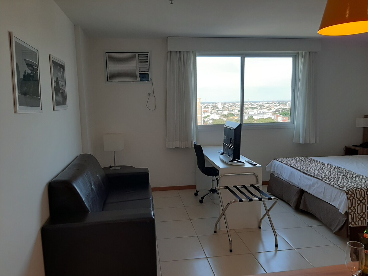 Flat completo no Edifício America Hotel & Residence, na melhor localização da cidade. Espaço com quarto, escritório, cozinha completa e banheiro. Inclui ar condicionado, TV por assinatura e Internet banda larga com wi-fi. Ideal para 2 ou 3 pessoas. O sofá cama de casal permite que durmam 4 pessoas confortavelmente. O condomínio tem estrutura completa com piscina, sauna, restaurante, academia, espaço kids e muito mais.
