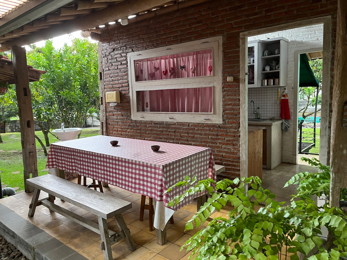 Experience the charm of traditional living at Javanese traditional wooden house's Joglo Retreat, exclusively yours for memorable family gatherings. Our Joglo house comfortably sleeps 6-7 adults across three rooms, set in a tranquil village backdrop. From waking up to soft village sounds to exploring the lush gardens, the property guarantees a memorable family getaway. Modern comforts like warm showers, Wi-Fi, and a fully-equipped kitchen blend seamlessly into this traditional setting.
