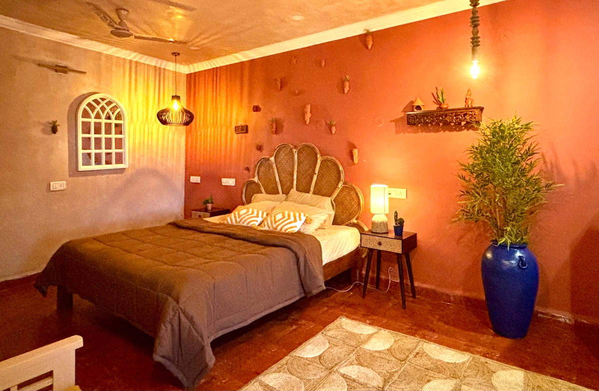 Our Signature Room is a design-forward space featuring a King bed, an open to sky bathroom, and a bathtub blending comfort with thoughtful aesthetics. The room is equipped with high-speed Wi-Fi, air conditioning, and a smart TV for a seamless stay. Located just 1.5 km from the beach and 900 meters from the local market, the property offers easy access while remaining a peaceful retreat. Our spaces are intentionally designed to foster community, creativity, and authentic travel experiences.