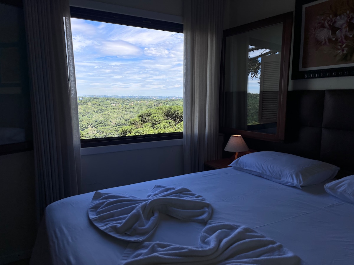 Espetacular Apartamento Suíte, c/ quarto p/ casal, sala 2 ambientes e cozinha, todo mobiliado em alto padrão, com uma vista maravilhosa. Moderno, c/ todos os recursos disponíveis p/ tornar a estadia memorável, junto às mais lindas vistas da Serra Gaúcha. Muito verde, opções de lazer e conforto ao seu redor. Tem banheira de hidromassagem, iluminação ambiente, geladeira, micro-ondas, etc.