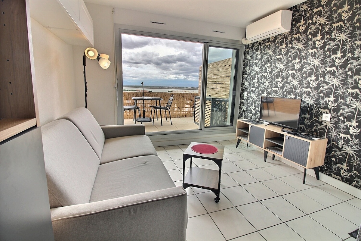 Stanovanje z 1 ločeno spalnico in teraso velikosti 5 m2, ki se idealno nahaja v marini Canet en Roussillon s pogledom na masiv Corbières. Nahaja se v zelo mirni ulici v tretjem nadstropju bivališča z dvigalom. To je 450 m hoje od plaže in deset minut hoje od središča mesta z zabavo v letovišču. Cena nočitve se lahko pogaja za dolgotrajne rezervacije, daljše od 15 dni. Postaja TGV je oddaljena 15 km, avtobusna postaja pa je oddaljena 800 m.