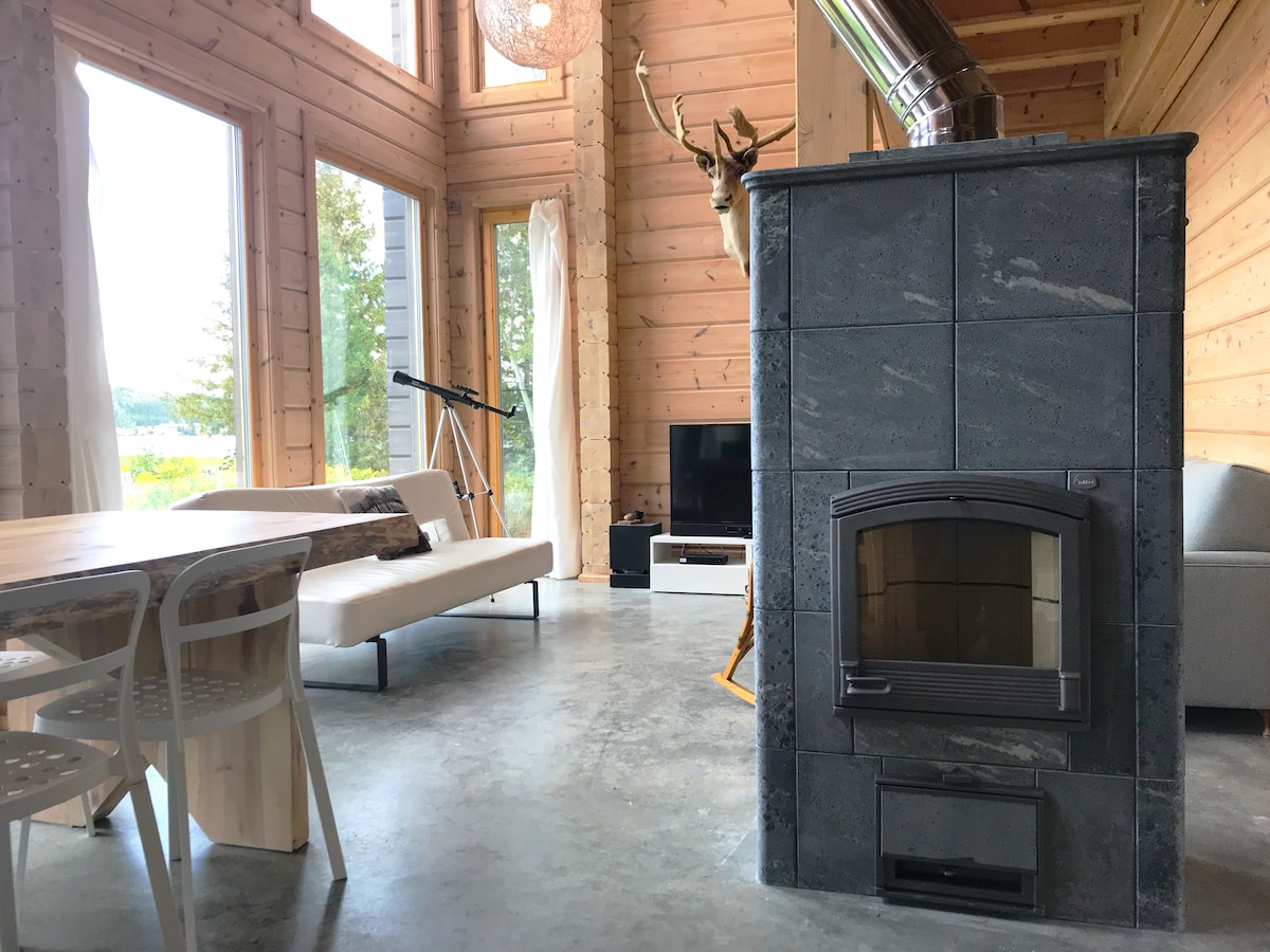 Modern cabin with spa and fireplace in nature