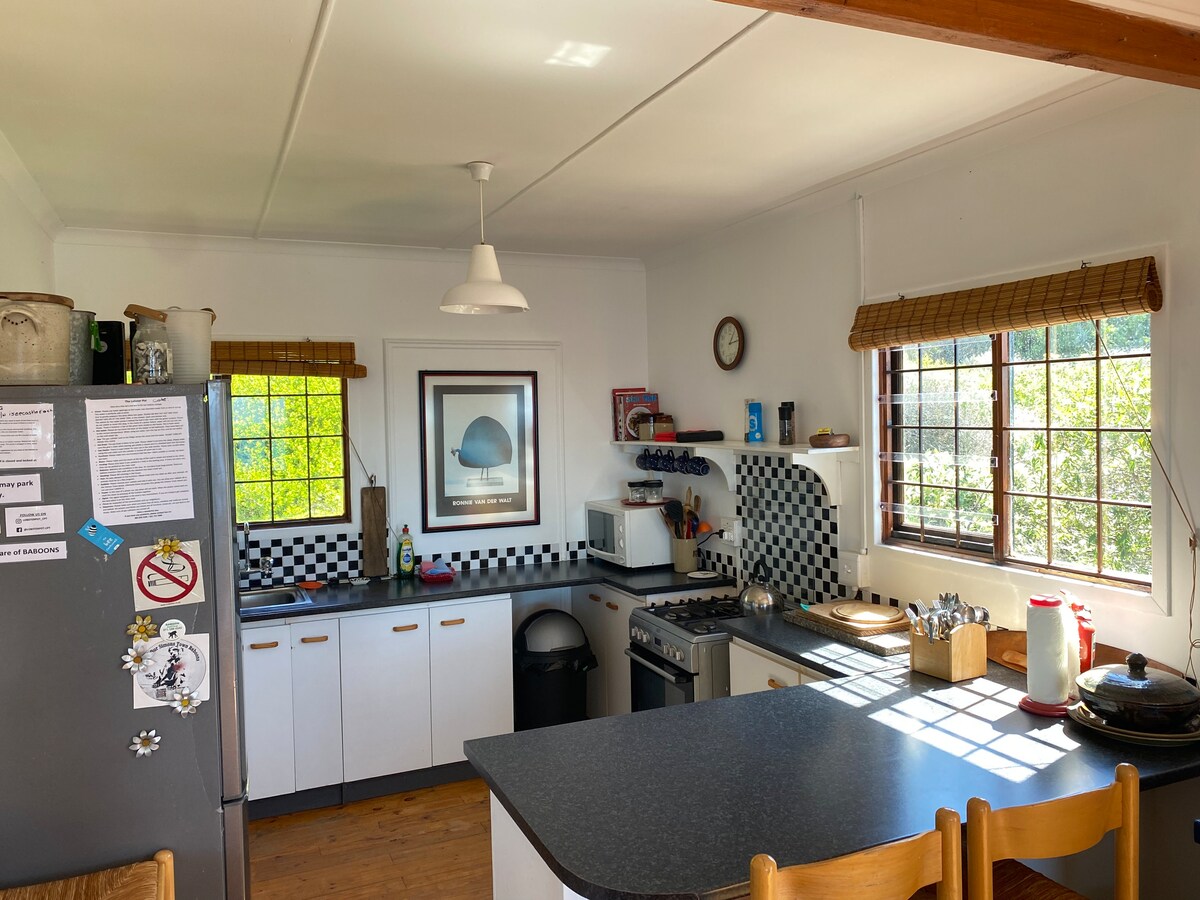 Mirna in varna hiška na deželi z ločenim vrtnim stanovanjem, ki ponuja popolnoma opremljeno družinsko nastanitev v listnatem predmestju Newlanda v bližini parka Keurboom. S terase se razprostira pogled na goro, varno parkiranje in zasebni obzidan vrt z bazenom. Glavna hiša spi 4-5 (dvoposteljne, enojne in enoposteljne sobe), vrtno stanovanje pa 2-4 (spalnica z zakonsko posteljo in raztegljiv kavč v dnevni sobi). Za daljšo zimsko prenočišče izven sezone - za razpoložljivost se obrnite na nas.