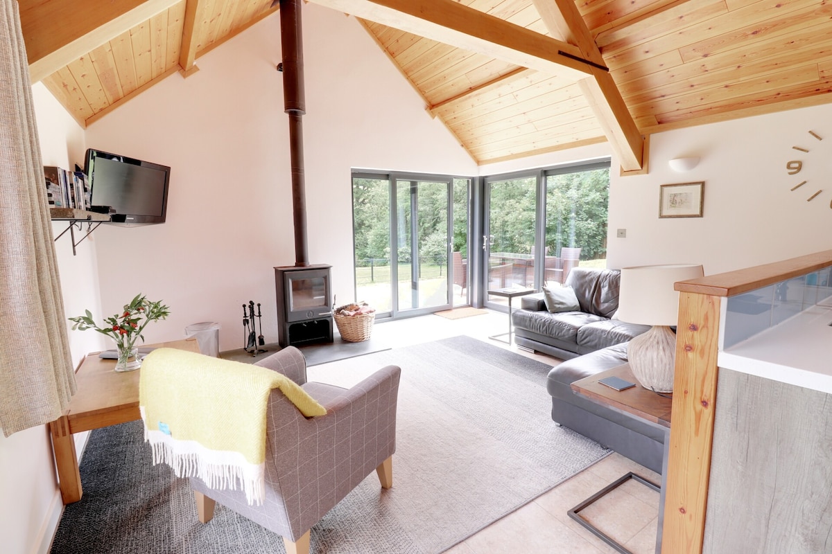 Comfortable self contained one bedroom log cabin located in 2 acres of amazing landscaped gardens and woods on the river Lyhner. This beautiful location will take your breath away. The sound of the river and the birds will bring you peace and tranquility. Relax and enjoy the extensive gardens next to the river at your leisure. Balcony with armchair and bar stools and private picnic area. The Manor House pub is a five minute walk for those wishing to dine out. Perfect for The Green wedding venue