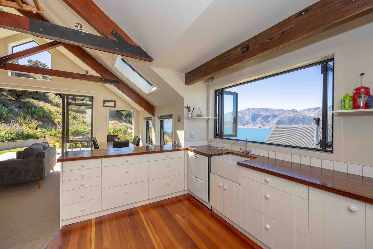 Lake View Earth Cottage sits 134 metres above Hawea township and overlooks Lake Hāwea and surrounding mountains with world-class 180° views. The hand-crafted earth home is nestled in native New Zealand bush and has rustic wooden beams throughout. The house comprises an open-plan living and dining area and outdoor dining, with spectacular views of the lake and mountains. Located up a rural gravel road, hidden away from suburban areas, the home is bound to make you say WOW.