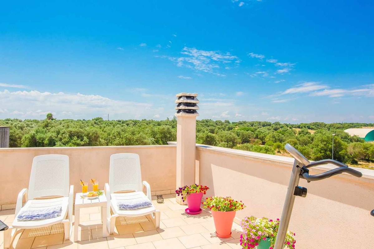 A Carovigno, un borgo a 6 km da Ostuni. L'appartamento ha la terrazza con vista ulivi. A disposizione: un dondolo, sdraio una cyclette ed un barbecue. Ospita 4+3 posti letto ed è posizionata in periferia in una via tranquilla. Qui si può nuotare nella Riserva di Torre Guaceto entro 10 minuti d’auto, fare una passeggiata in piazza castello entro 500 metri a piedi o guidare per soli dieci minuti per visitare alcune delle città più affascinanti della Puglia.