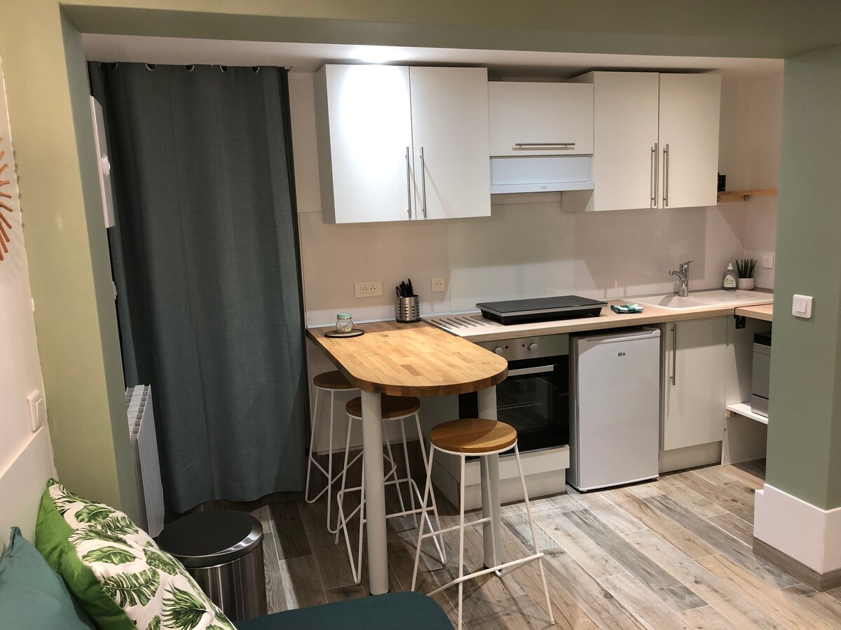 The housing «Jade» is a cocoon of 23m², quiet, soft and colorful decoration, and located in a neighborhood where you will feel safe. Nastanitev je popolnoma neodvisna od hiše, v kateri živimo. Nahaja se 5 minut hoje od postaje Houilles. Stanovanje z višino stropa 2m10 je sestavljeno iz treh sob, ki so dobro sorazmerne : prostor za sedenje in popolnoma opremljena kuhinja v enaki prostornini, spalnica in kopalnica.