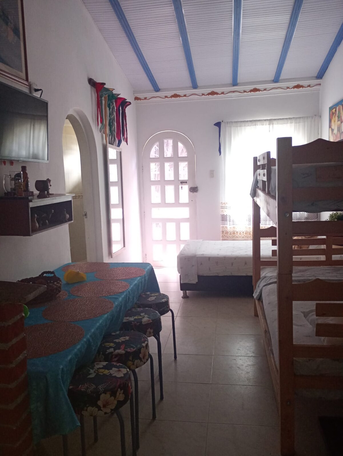 Este lindo MINI ESTUDIO es una habitación con baño y cocina privados. Ideal para estadías de ocio o trabajo. Ubicado en el barrio Canapote (Daniel Lemaitre), barrio local, casa de huéspedes muy tranquila, rodeada de plantas. El centro histórico y playas de Marbella se encuentran a 10 minutos en taxi. La playa del barrio Crespo está a 10-15 minutos caminando. Un alojamiento muy económico para visitar Cartagena.