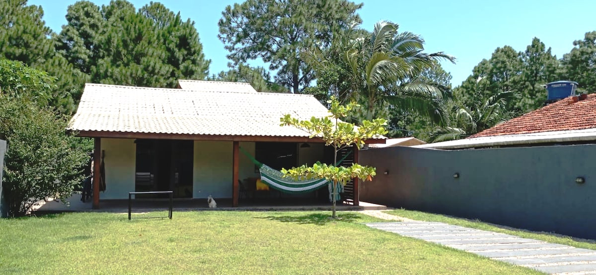 Casa ampla com 3 dormitórios. Primeiro quarto: 1 suíte com cama baixa queem, armário, ar condicionado. Segundo quarto com cama casal, armário e ar condicionado. 1 banheiro social. Segundo andar: mezanino com sofá cama e smart tv. Terceiro quarto com cama de casal queem, armário e ar condicionado. Sala e cozinha conjugada. Área externa com churrasqueira, redes, sofás rústicos para relaxar. Um banheiro sem chuveiro. Jardim, ducha externa. Estacionamento.