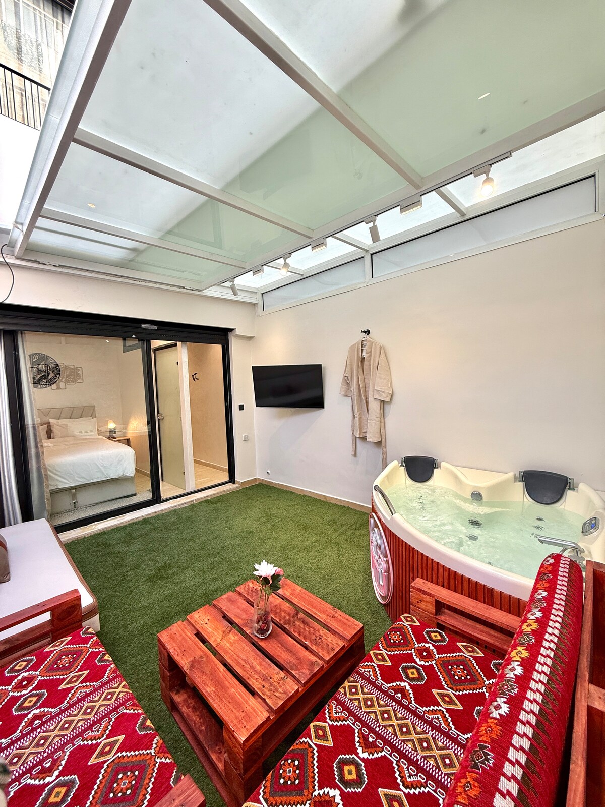 Potopite se v prijetno vzdušje, ki je sodobno in obogateno z maroškim obrtnim pridihom. Naše pristno stanovanje se nahaja le 8 minut od mednarodnega letališča Casablanca Mohammed 5. Stanovanje ima 2 spalnici, eno z 1 zakonsko posteljo,enojno posteljo in sodno posteljo. Druga z zakonsko posteljo (King). Na voljo je tudi velika dnevna soba, popolnoma opremljena kuhinja, velika terasa in kopalnica v spalnici s prho.